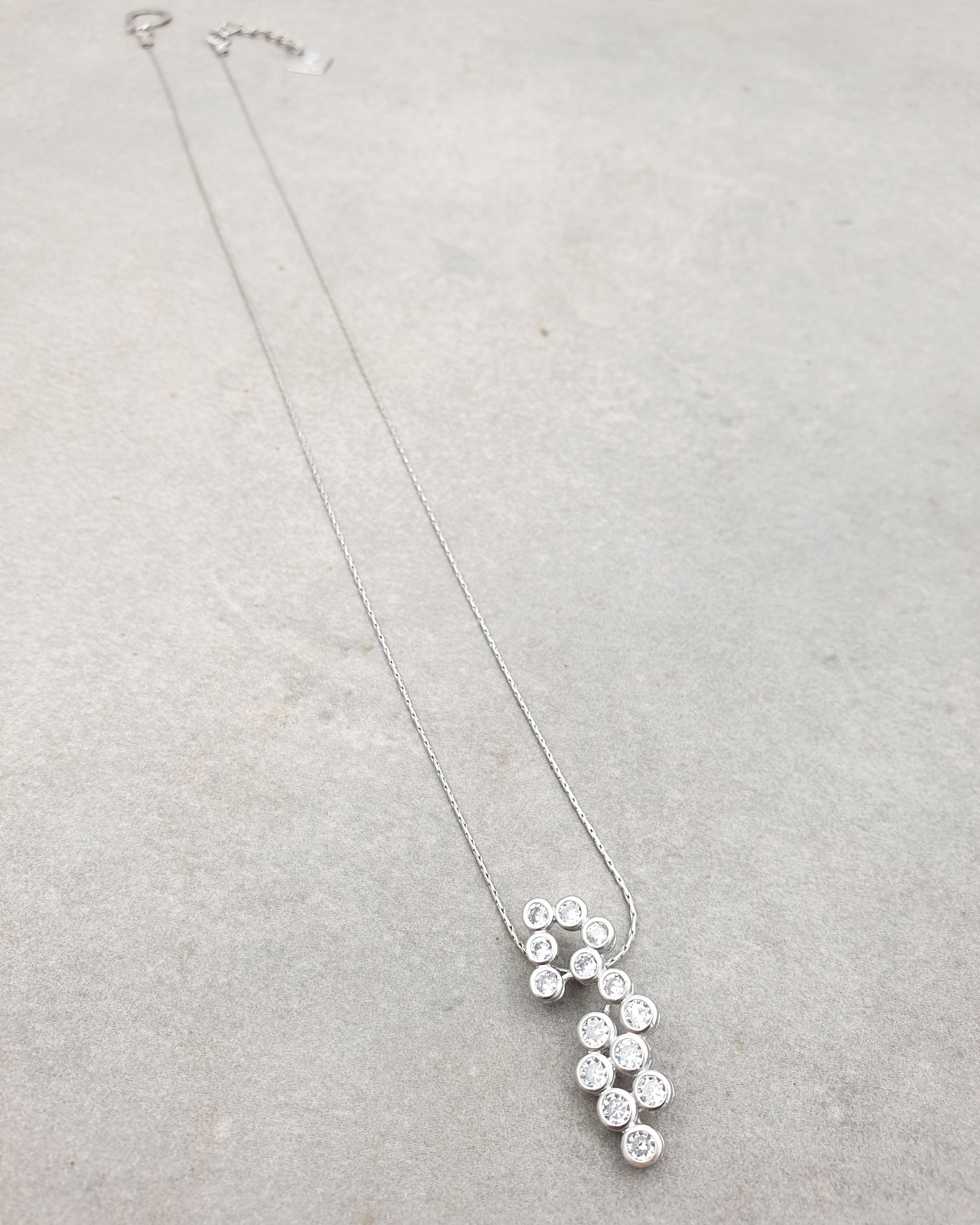 שרשרת עדינה עם תליון מקסים המורכב מקבץ אסימטרי של זירקונים שקופים משובצים. ניתן לענוד גם בשילוב שרשראות נוסף למראה שכבות. השרשרת בציפוי ישראלי איכותי של כסף ובגימור מט. הפריט מגיע ארוז למתנה ועם אחריות לשנה. ניתן להוסיף ברכה אישית ופתק החלפה.