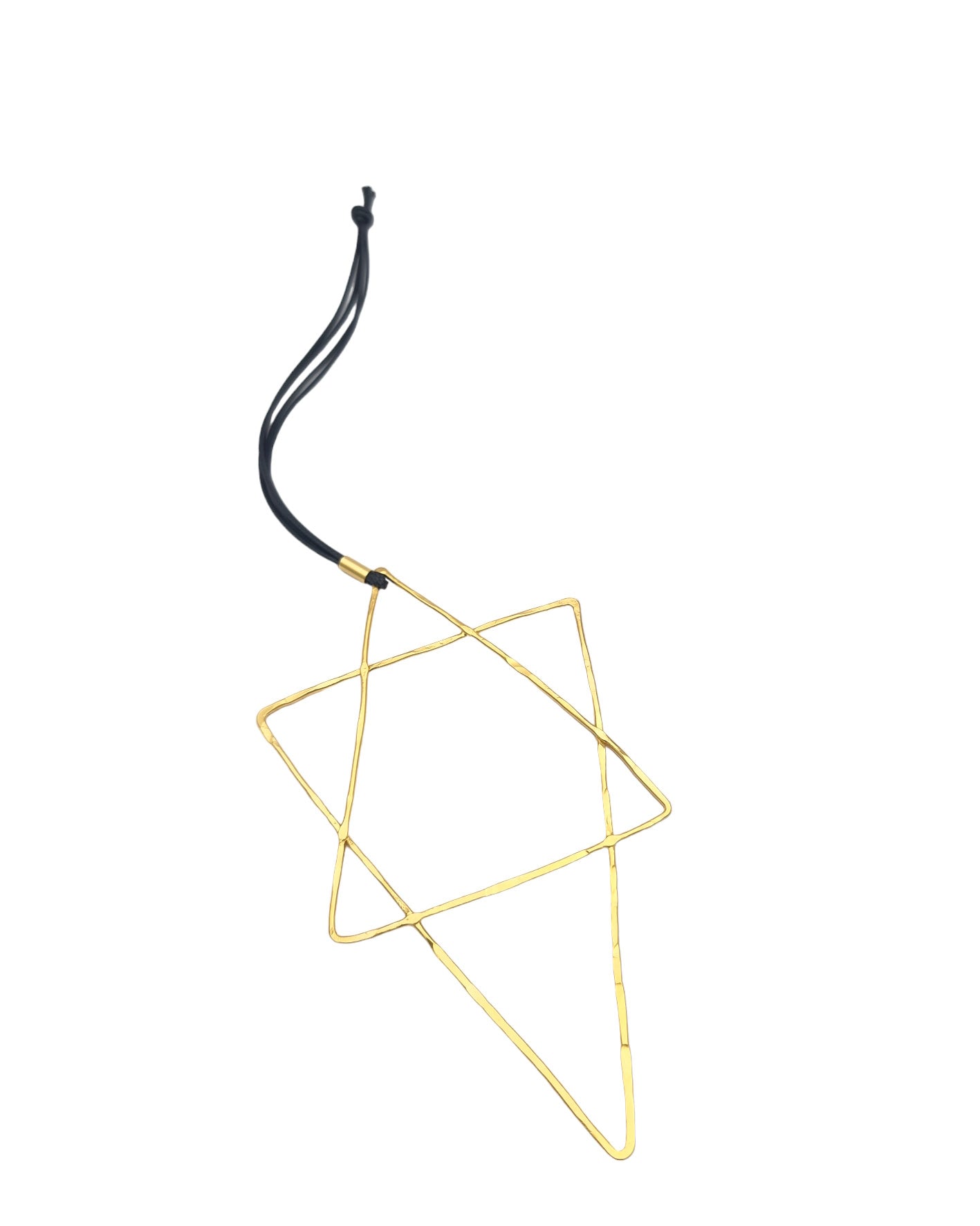תליון מגן דוד ענק, מוארך וא-סימטרי עשוי בעבודת יד מלאה ומצופה ציפוי ישראלי איכותי של זהב 24 קראט בגימור מט, על חוטי כותנה שחורים. מתאים לתליה על הקיר, לרכב, על עגלה. מתנה מיוחדת ביותר מלאת משמעות וסימבוליות. הפריט מגיע ארוז למתנה ועם אחריות לשנה. ניתן להוסיף ברכה אישית ופתק החלפה.
