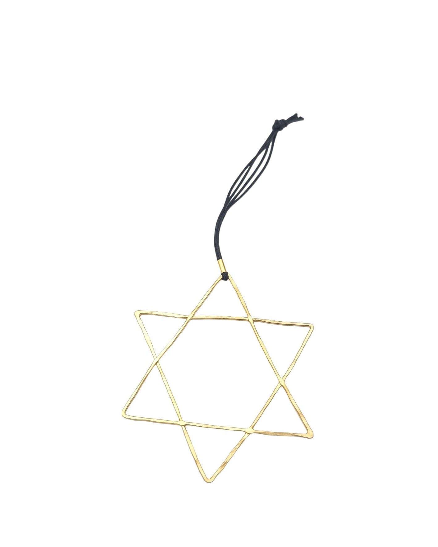 תליון מגן דוד ענק, מוארך וא-סימטרי עשוי בעבודת יד מלאה ומצופה ציפוי ישראלי איכותי של זהב 24 קראט בגימור מט, על חוטי כותנה שחורים. מתאים לתליה על הקיר, לרכב, על עגלה.. מיוחדת ביותר מלאת משמעות וסימבוליות. הפריט מגיע ארוז למתנה ועם אחריות לשנה. ניתן להוסיף ברכה אישית ופתק החלפה.