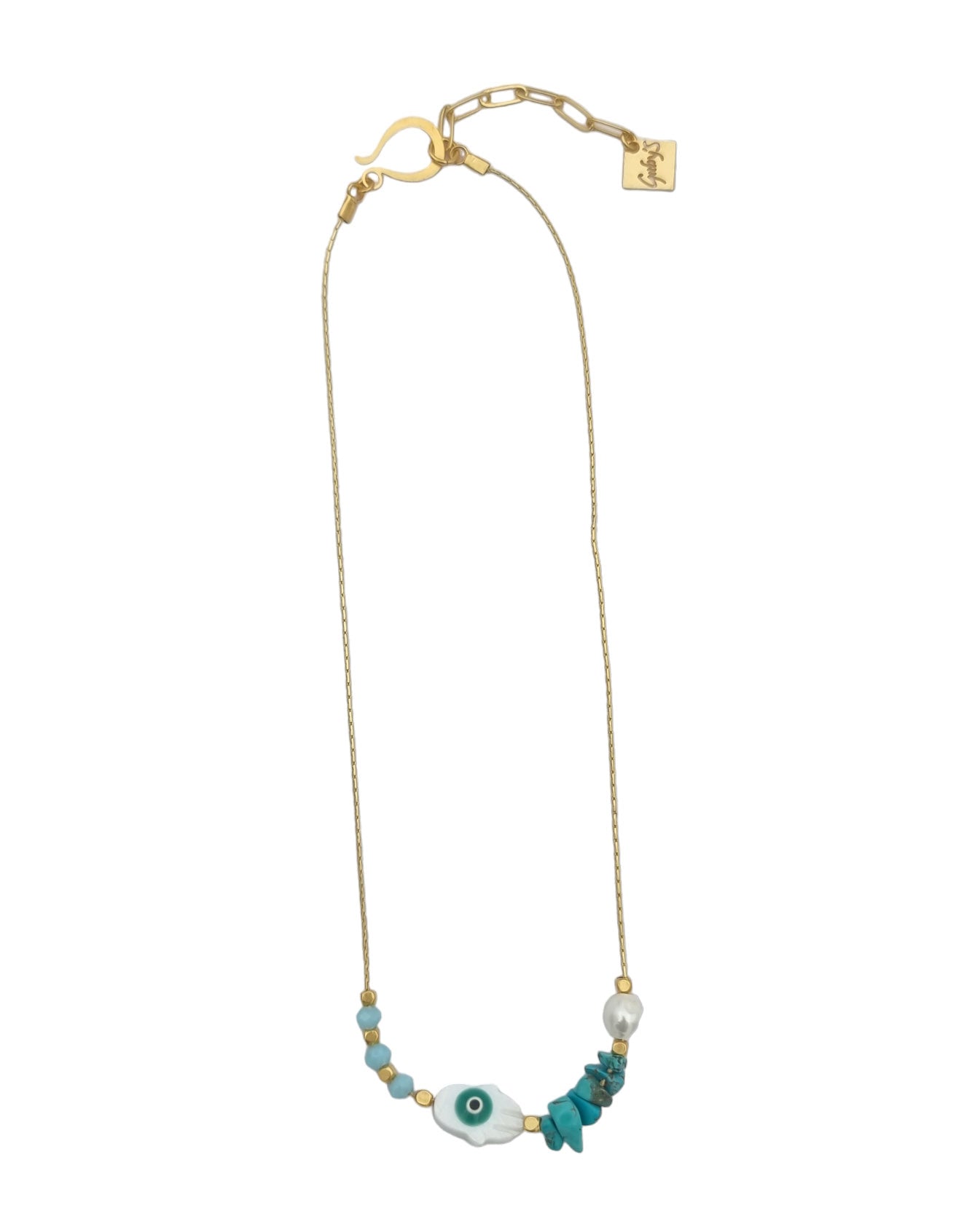 שרשרת עדינה א-סימטרית ותליון בצורת חמסה עשוי מצדף ועליו אמייל בצורת עין, בשילוב קריסטלים בגוון תכלת, אבני טורקיז ופנינה אמיתית.