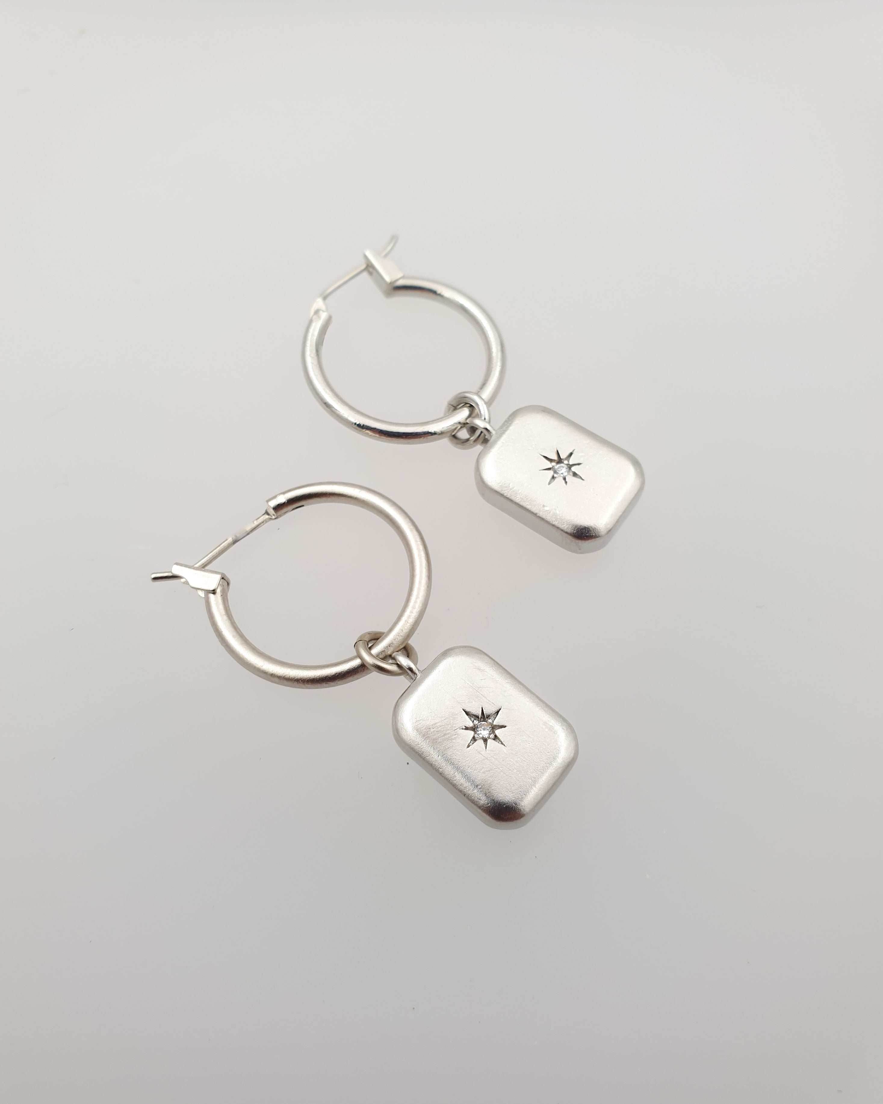 עגילי חישוק ועליהם תליון בצורת מלבן בעל נפח משובץ זירקון, ניתן לענוד גם ללא התליון. העגילים בציפוי ישראלי איכותי של כסף. תולה העגיל הינו היפו אלרגני. הפריט מגיע ארוז למתנה ועם אחריות לשנה. ניתן להוסיף ברכה אישית ופתק החלפה.