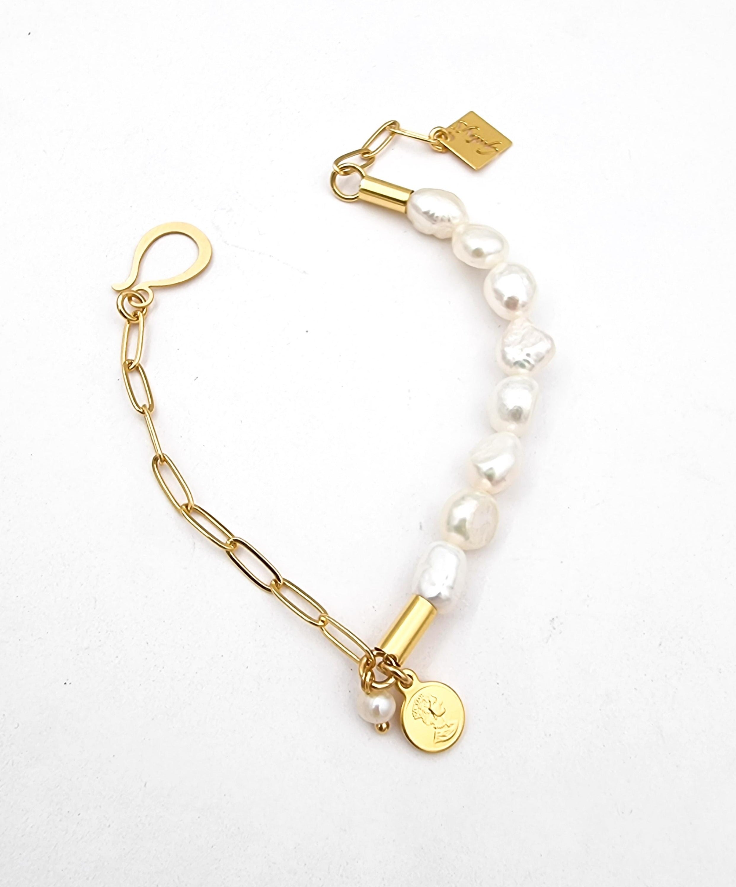 צמיד שיקי א-סימטרי העשוי מרצף פנינים אמתיות ושרשרת לולאות מלבניות בציפוי ישראלי איכות של זהב 24 קראט ותליון פנינה ומטבע.