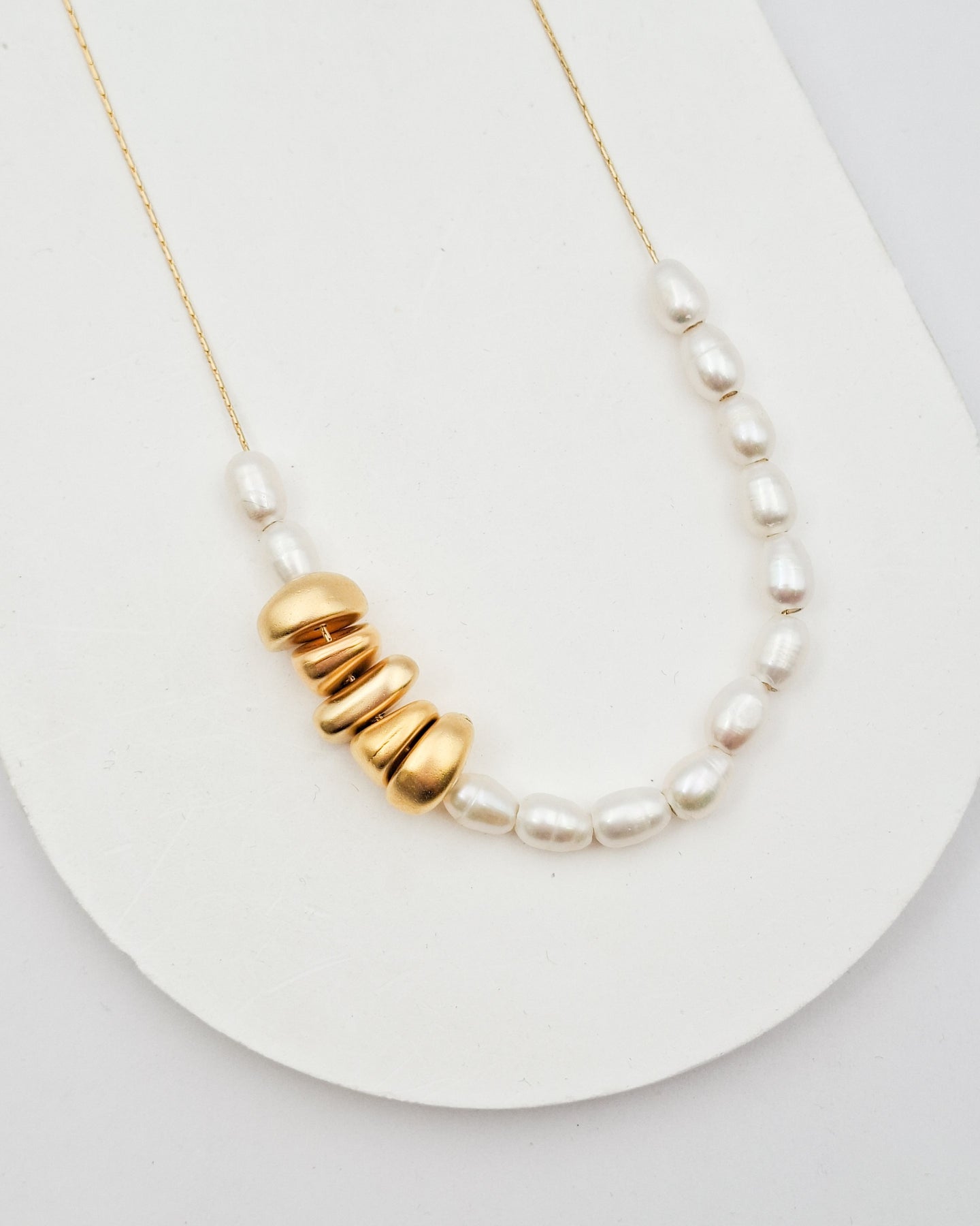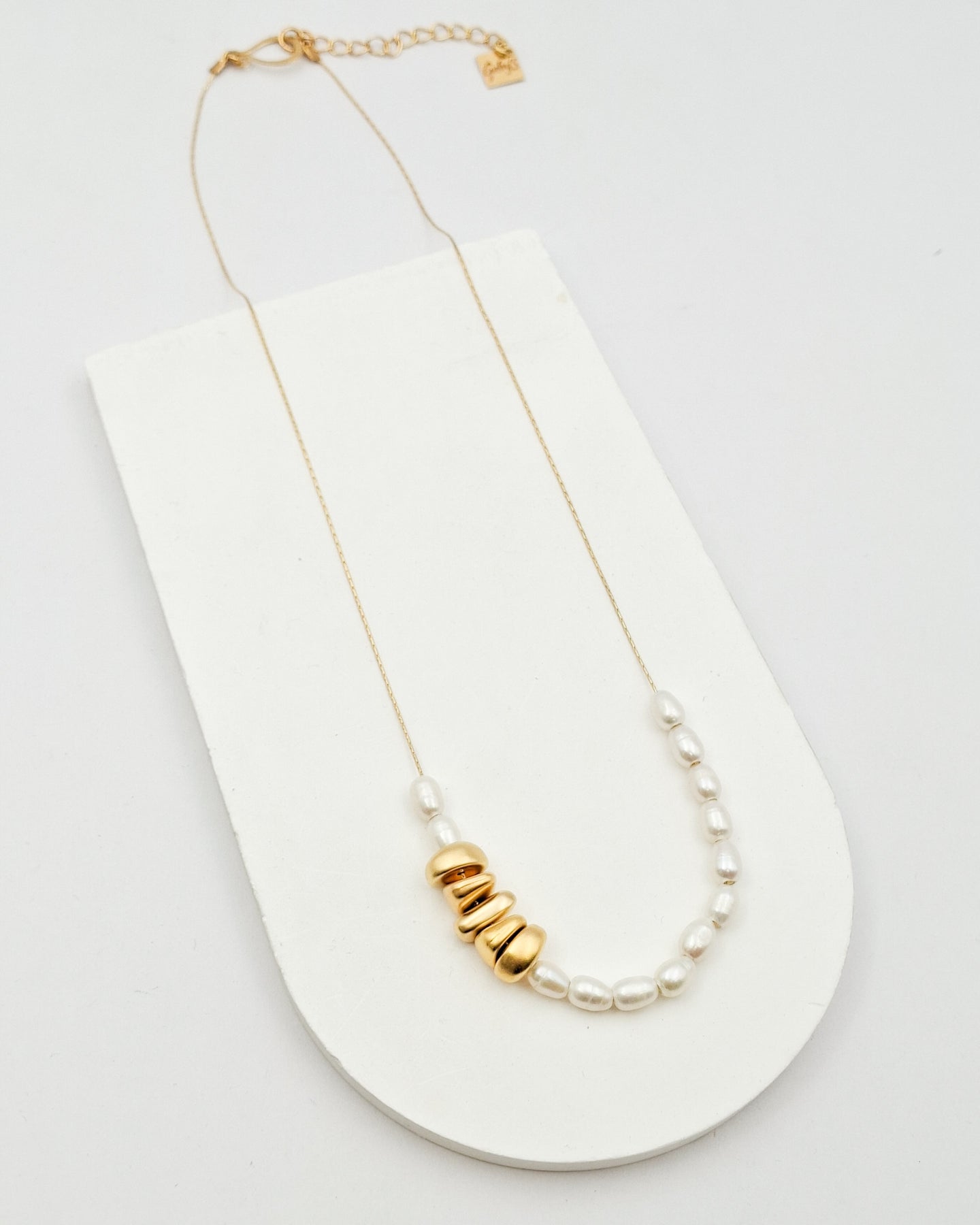 שרשרת קצרה המשלבת פנינים אמתיות ואלמנטים א-סימטריים בציפוי זהב 24 קראט. השרשרת והאלמנטים בציפוי ישראלי איכותי של זהב 24 קראט. הפריט מגיע ארוז למתנה ועם אחריות לשנה. ניתן להוסיף ברכה אישית ופתק החלפה.