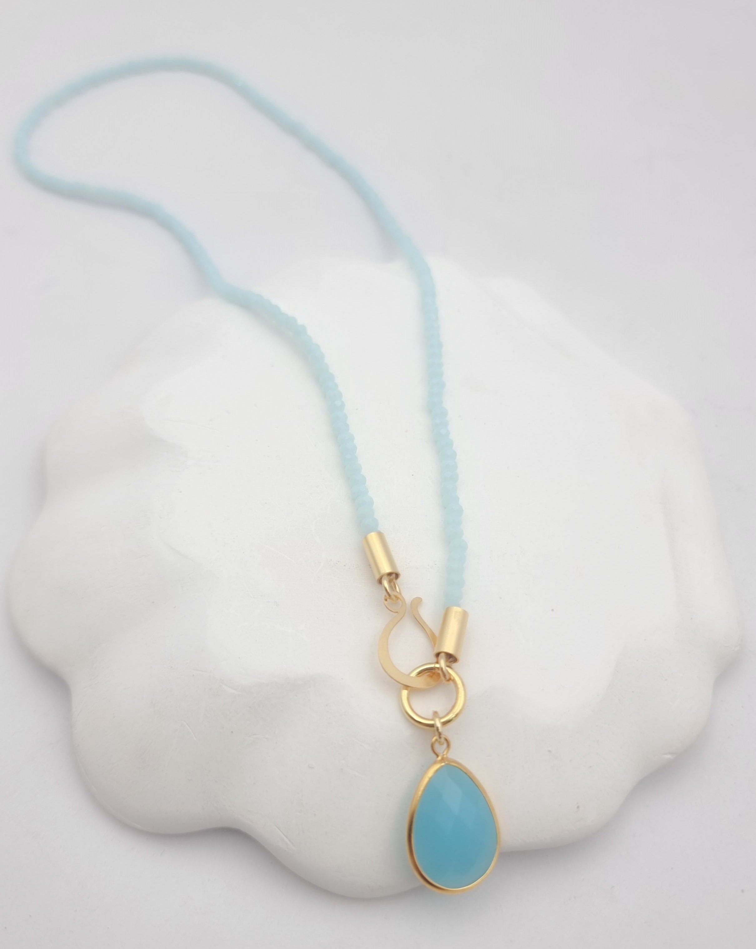שרשרת קצרה עשויה קריסטלים בגוון תכלת אקווה עם סגירה קדמית ותליון קריסטל בגוון טורקיז בהיר בצורת טיפה ממוסגרת. ניתן לענוד לבד או בשילוב שרשראות נוספות למראה שכבות. האלמנטים בציפוי ישראלי איכותי של זהב 24 קראט. הפריט מגיע ארוז למתנה ועם אחריות לשנה. ניתן להוסיף ברכה אישית ופתק החלפה.