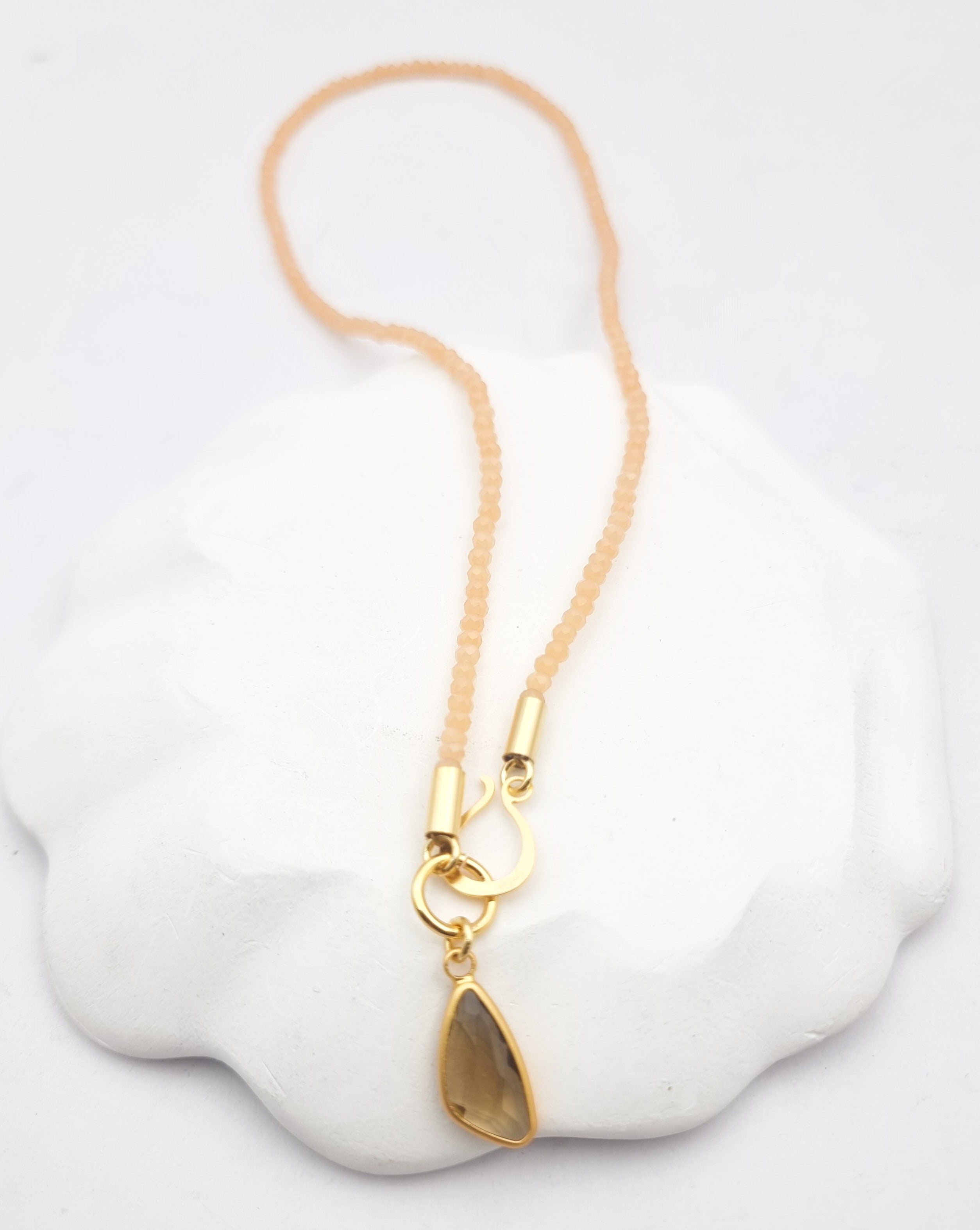 שרשרת קצרה עשויה קריסטלים בגוון ניוד עם סגירה קדמית ותליון קריסטל בגוון מעושן בצורת משולש ממוסגר. ניתן לענוד לבד או בשילוב שרשראות נוספות למראה שכבות. האלמנטים בציפוי ישראלי איכותי של זהב 24 קראט. הפריט מגיע ארוז למתנה ועם אחריות לשנה. ניתן להוסיף ברכה אישית ופתק החלפה.