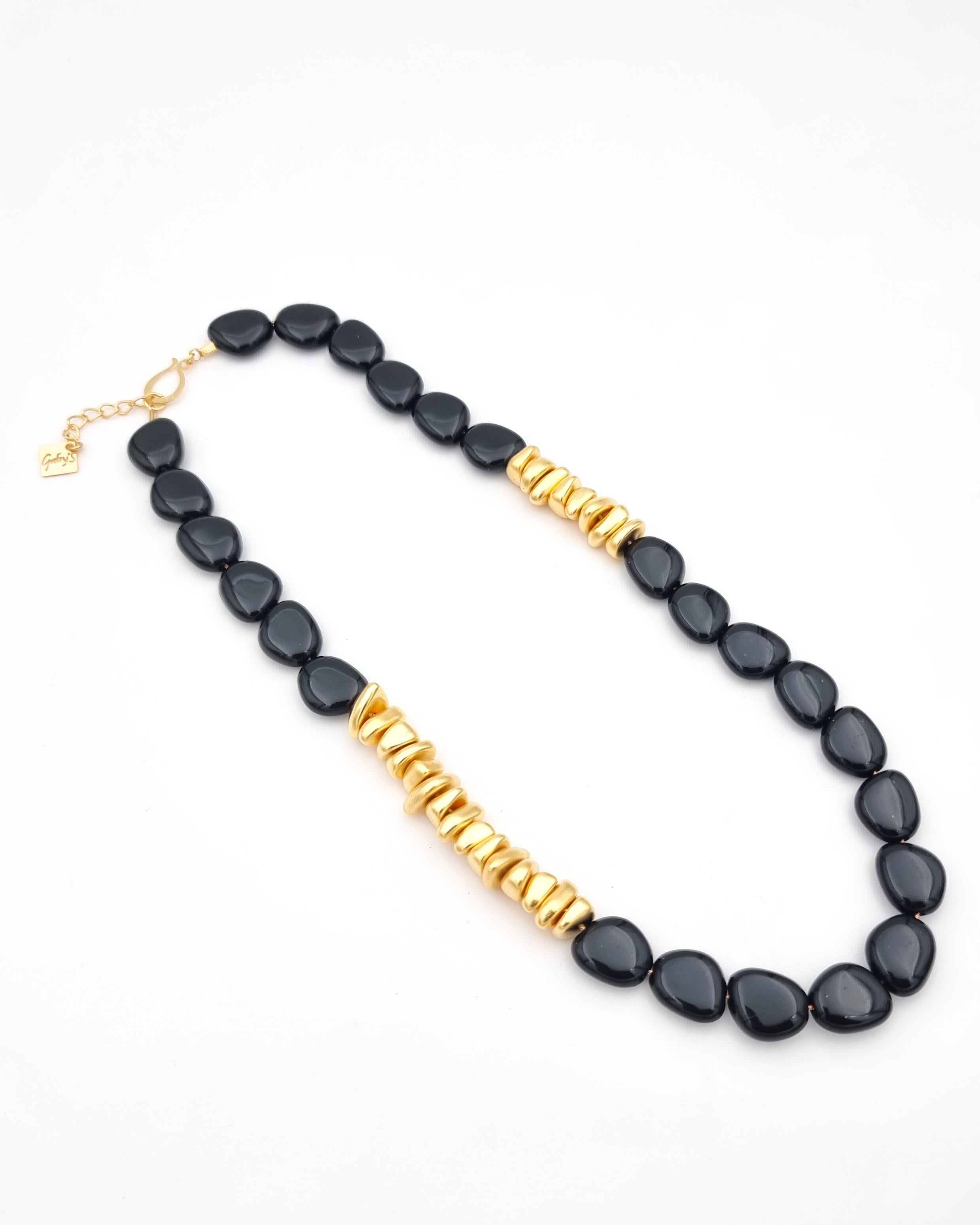 שרשרת קצרה של אלמנטים אקריליים שחורים  וא-סימטריים , המשולבת, בשני צדדיה, אלמנטים א-סימטריים בציפוי זהב 24 קראט ובגימור מט. השרשרת בציפוי ישראלי איכותי של זהב 24 קראט. הפריט מגיע ארוז למתנה ועם אחריות לשנה. ניתן להוסיף ברכה אישית ופתק החלפה.