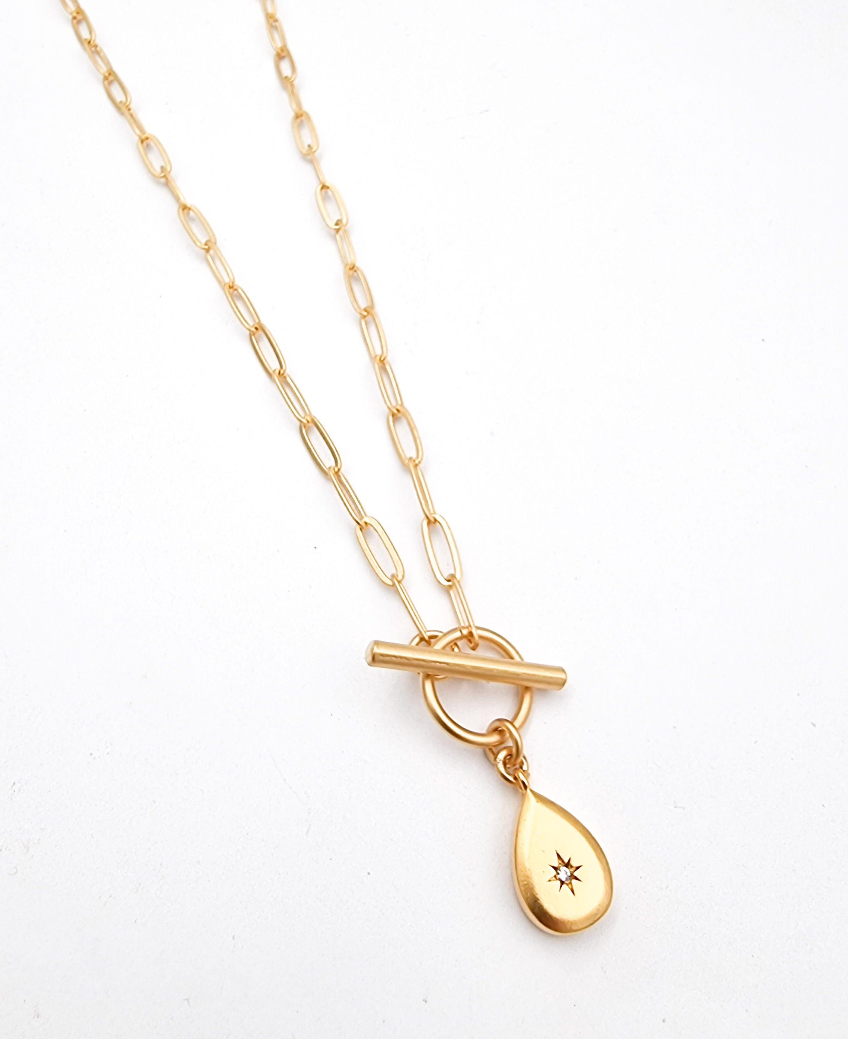 שרשרת קצרה אלגנטית בצורת חוליות מלבניות וסגירת T קדמית עליה תליון בצורת טיפה קטנה משובצת זירקון שקוף. השרשרת בציפוי ישראלי איכותי של זהב 24 קראט.