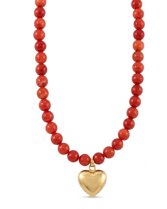 שרשרת קצרה מאבני קוורץ בגוון אדום כתמתם ותליון ממורכז של לב בעל נפח. ניתן לענוד לבד או בשילוב שרשראות נוספות למראה שכבות. האלמנטים בשרשרת בציפוי ישראלי איכותי של זהב 24 קראט. הפריט מגיע ארוז למתנה ועם אחריות לשנה. ניתן להוסיף ברכה אישית ופתק החלפה.