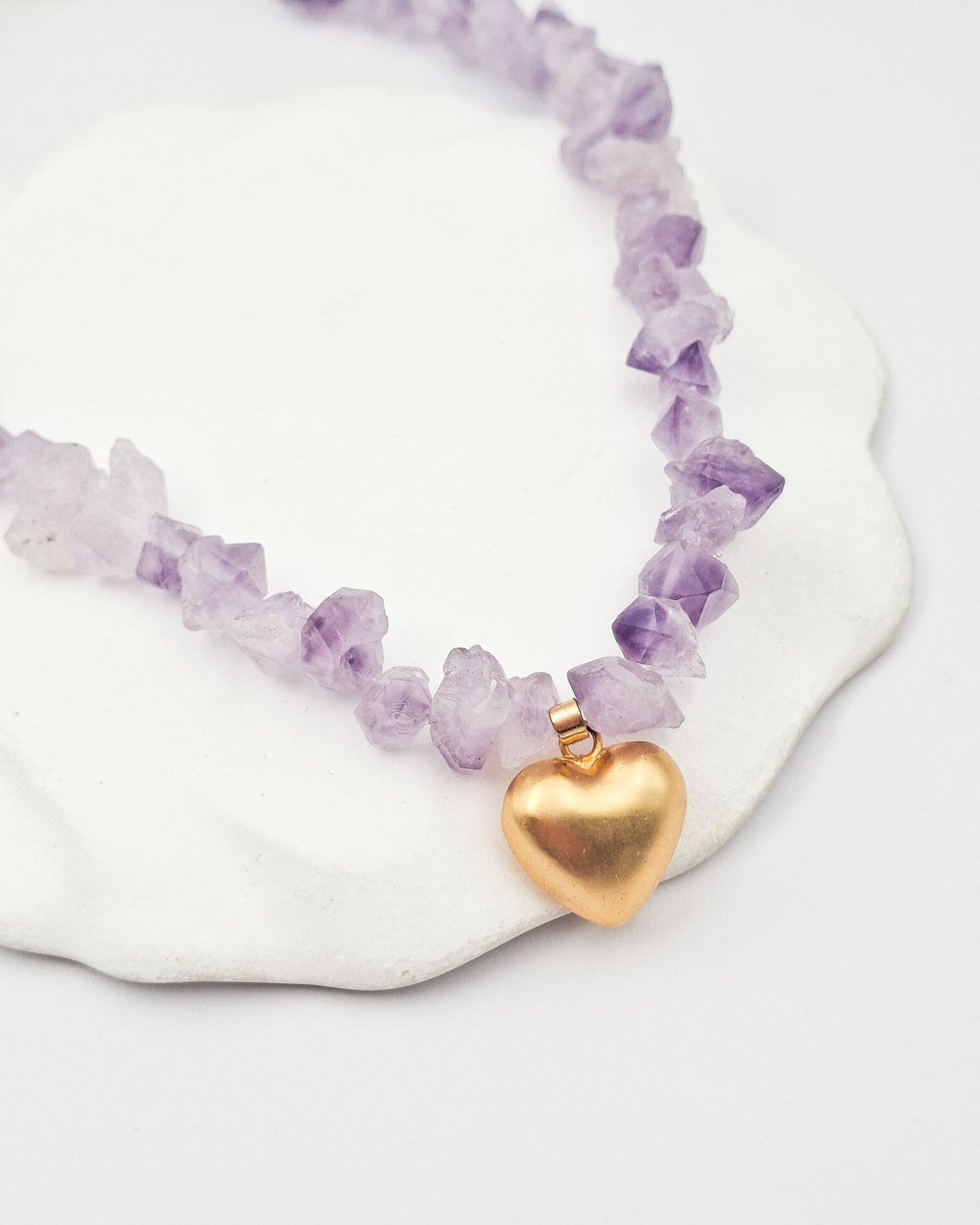 שרשרת קצרה ועשירה עשויה מאבנים אמתיות סגלגלות ותליון בצורת לב בעל נפח.