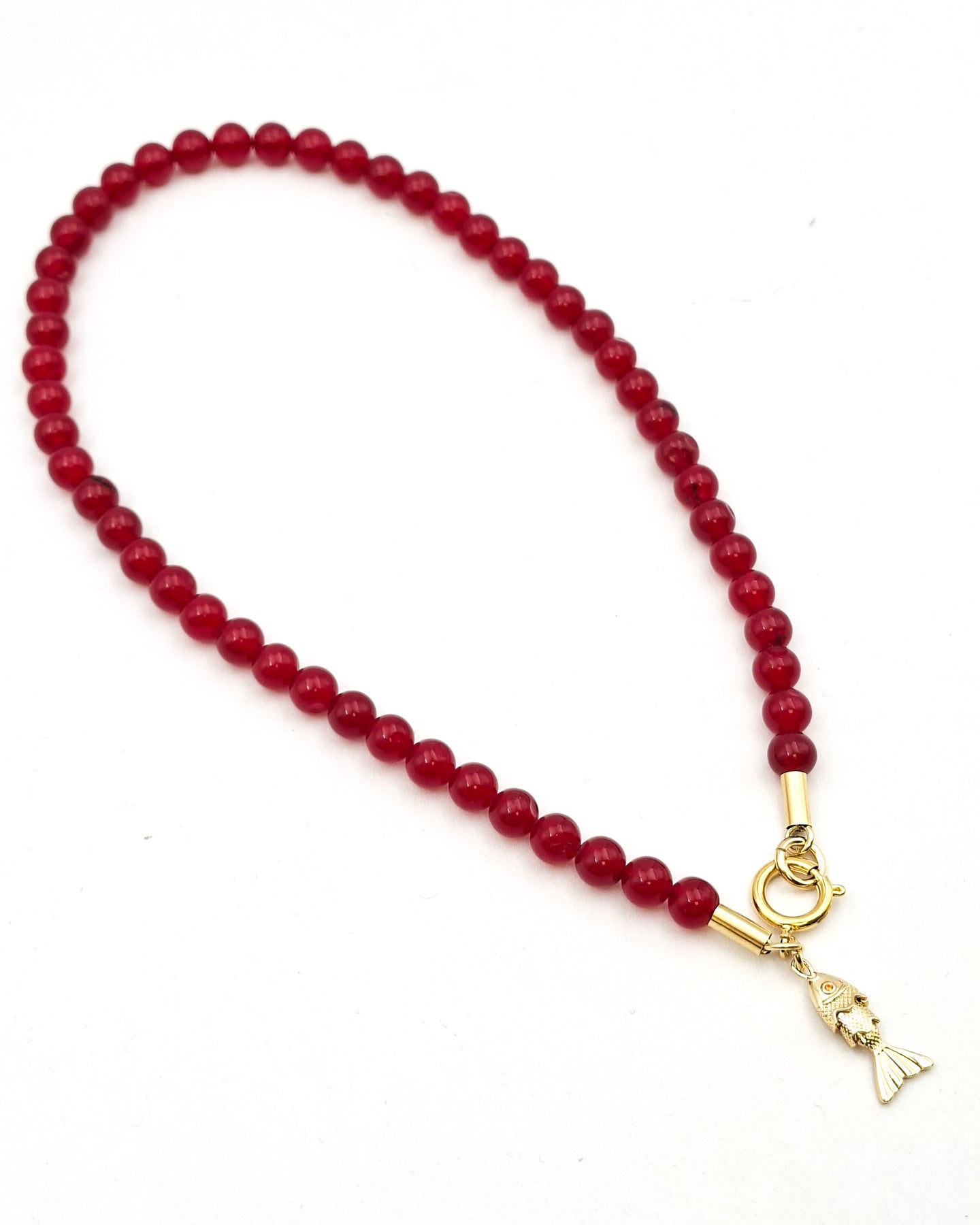 שרשרת קצרה מאבני קוורץ בגווני אדום עם סוגר קדמי ותליון של דג בשיבוץ זירקון ובעל תנועתיות. ניתן לענוד התליון מאחור למראה שרשרת "נקייה".תליון דג שיקי הוא סמל למזל, שפע ושמירה מעין הרע. האלמנטים בשרשרת בציפוי איכותי של זהב 24 קראט. הפריט מגיע ארוז למתנה ועם אחריות לשנה. ניתן להוסיף ברכה אישית ופתק החלפה.