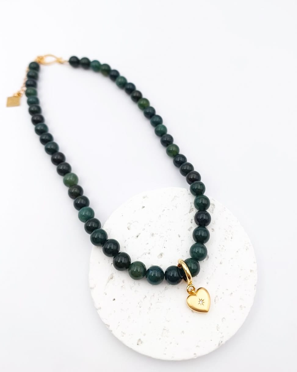 שרשרת קצרה מאבני קוורץ בגווני ירוק משתנים עם תליון נשלף בצורת לב משובץ זירקון שקוף. ניתן לענוד עם או בלי התליון, לבד או בשילוב שרשראות נוספות למראה שכבות. השרשת בציפוי ישראלי איכותי של זהב 24 קראט. הפריט מגיע ארוז למתנה ועם אחריות לשנה. ניתן להוסיף ברכה אישית ופתק החלפה.