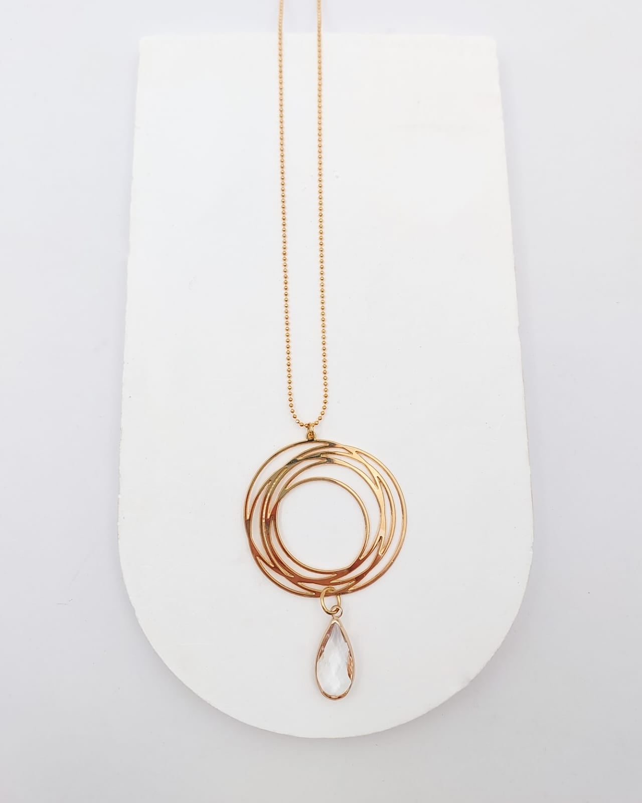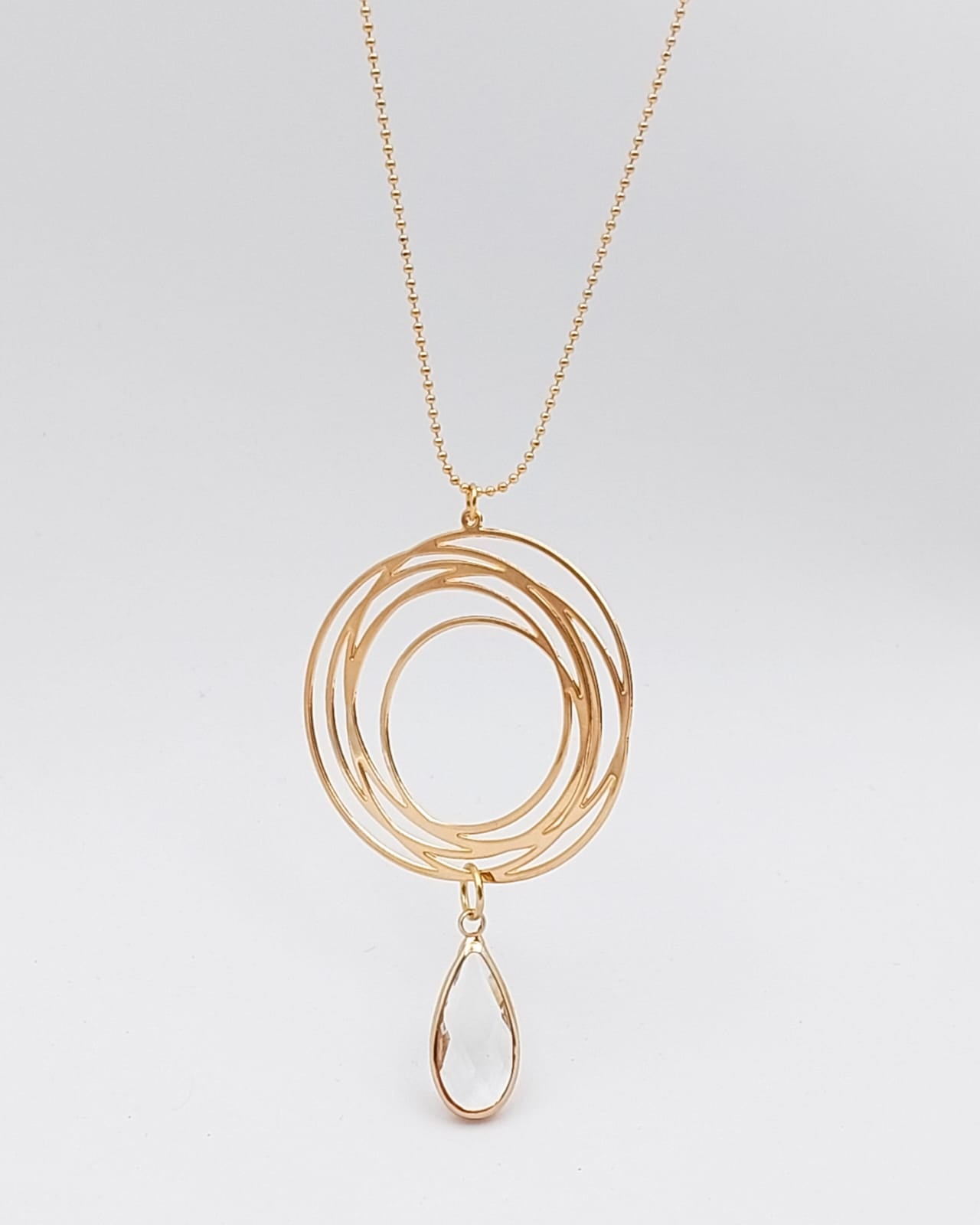 שרשרת דיסקית ארוכה עם תליון בצורת מערבולת ואליה מחובר קריסטל בצורת טיפה שקופה.