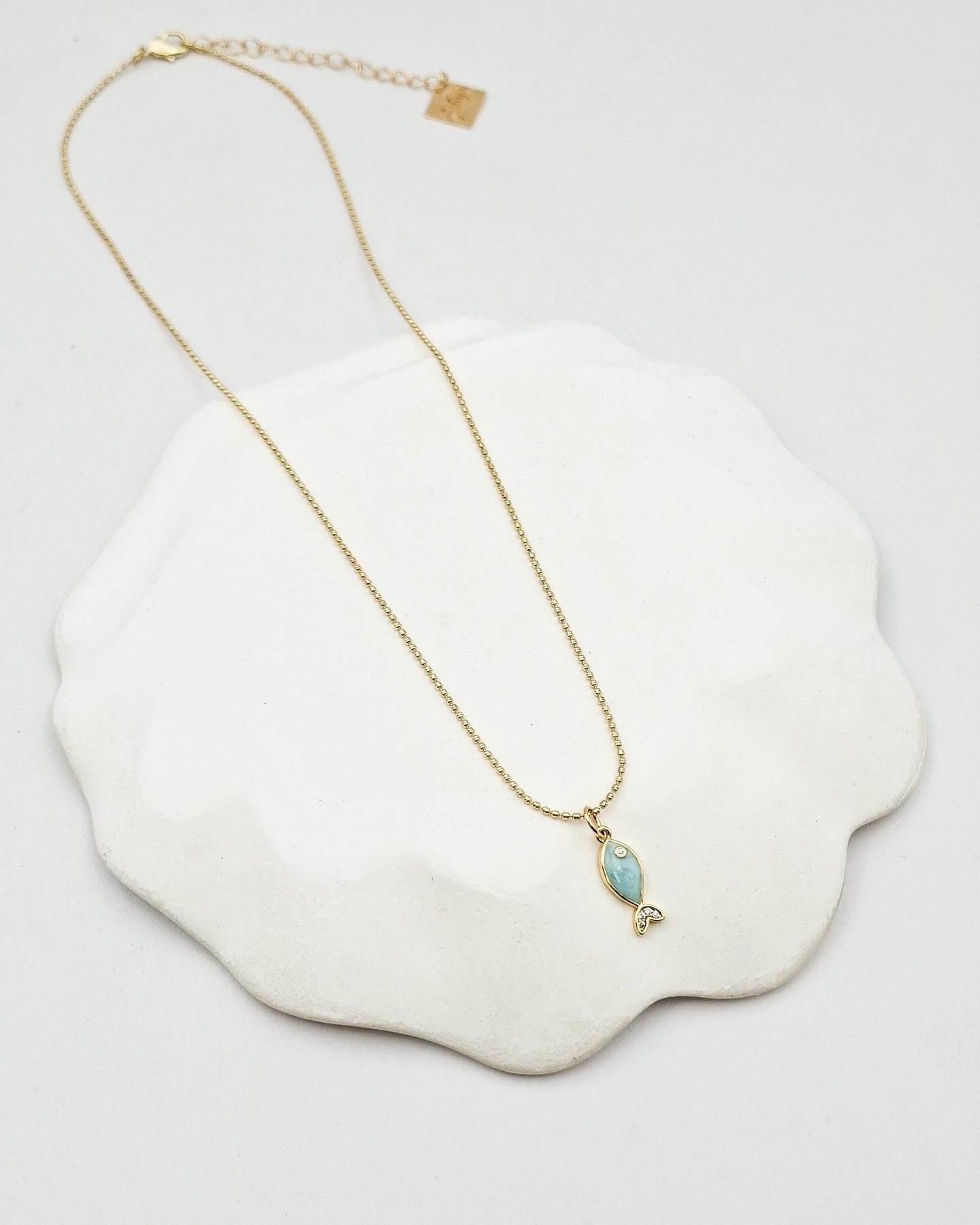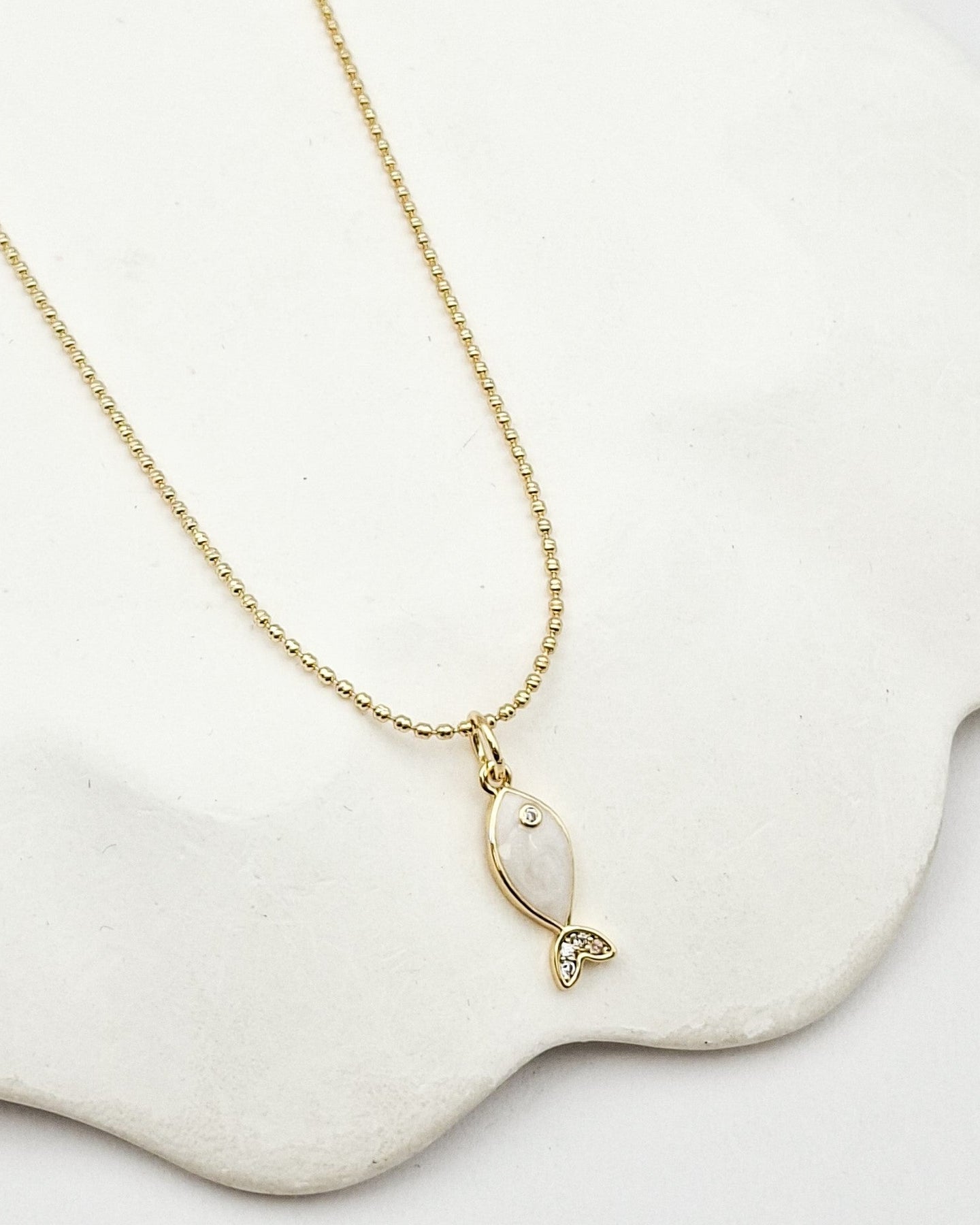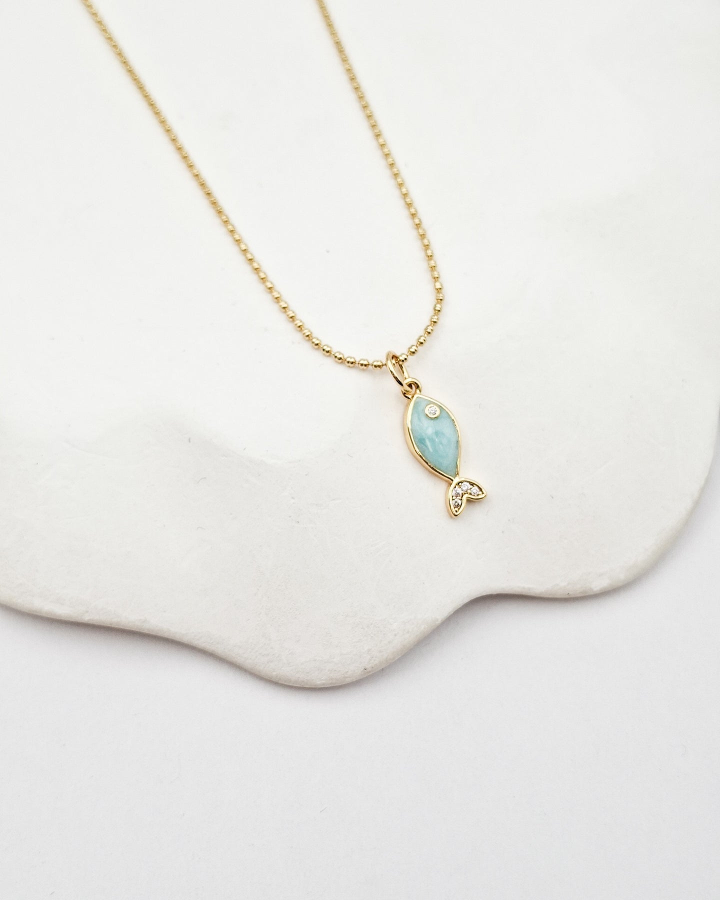 שרשרת כדוריות קצרה ועדינה בציפוי ישראלי איכותי והיפואלרגני של זהב 24 קראט עם תליון של דג קטנטן עם אמייל בגוון לבחירתך ומשובץ זירקונים שקופים.
