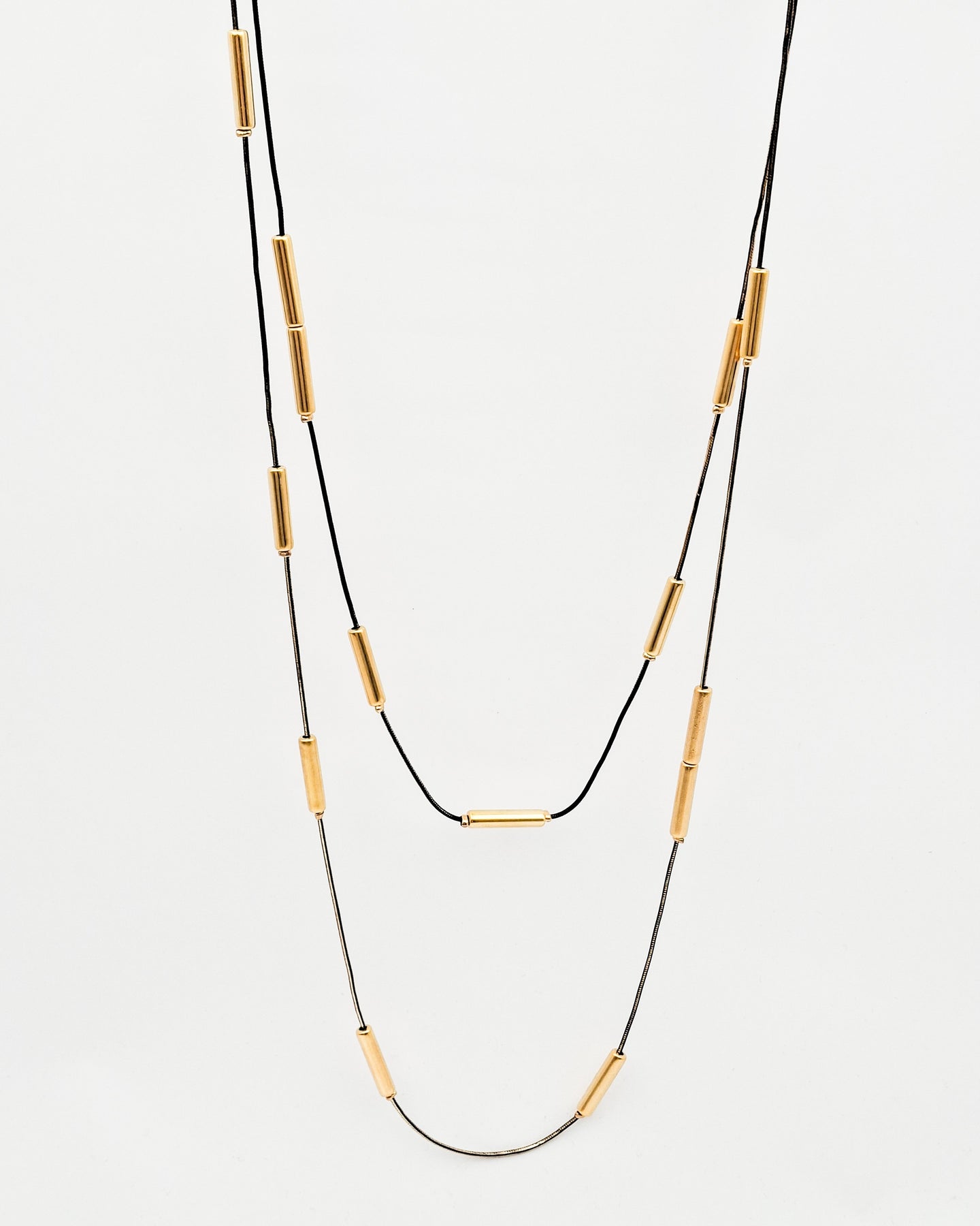שרשרת שתי שכבות מהממת, עדינה ואלגנטית עליה פזורים צינורות באופן אסימטרי בציפוי ישראלי איכותי של זהב 24 קראט. השרשרת בציפוי אופווייט מנצנץ או שחור מנצנץ, לבחירתך.
