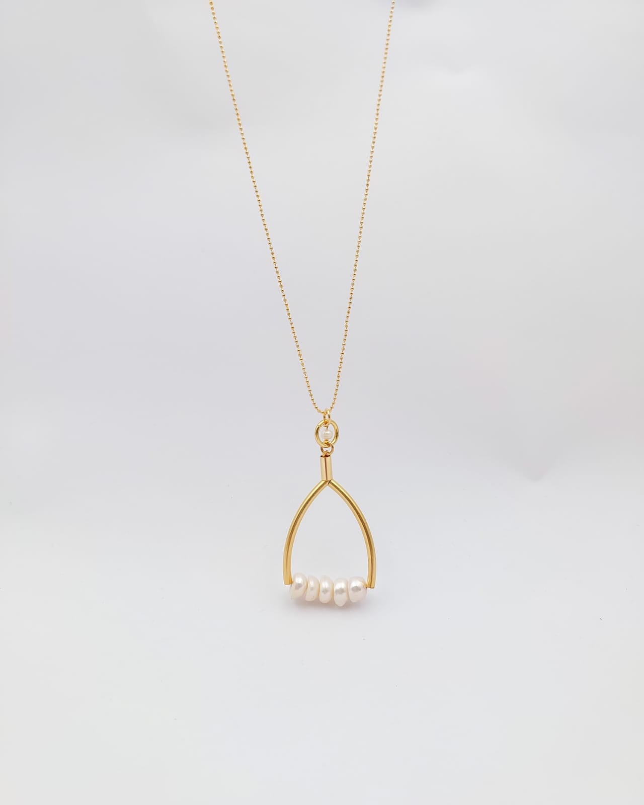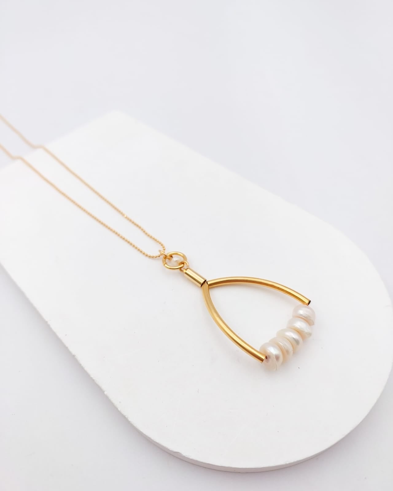 שרשרת דיסקית ארוכה עם תליון של צינורות דקים וחלולים בשילוב פנינים אמיתיות, היוצרים צורה מעניינת ומרשימה.