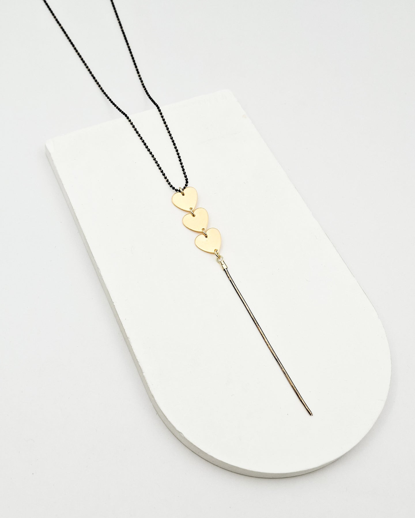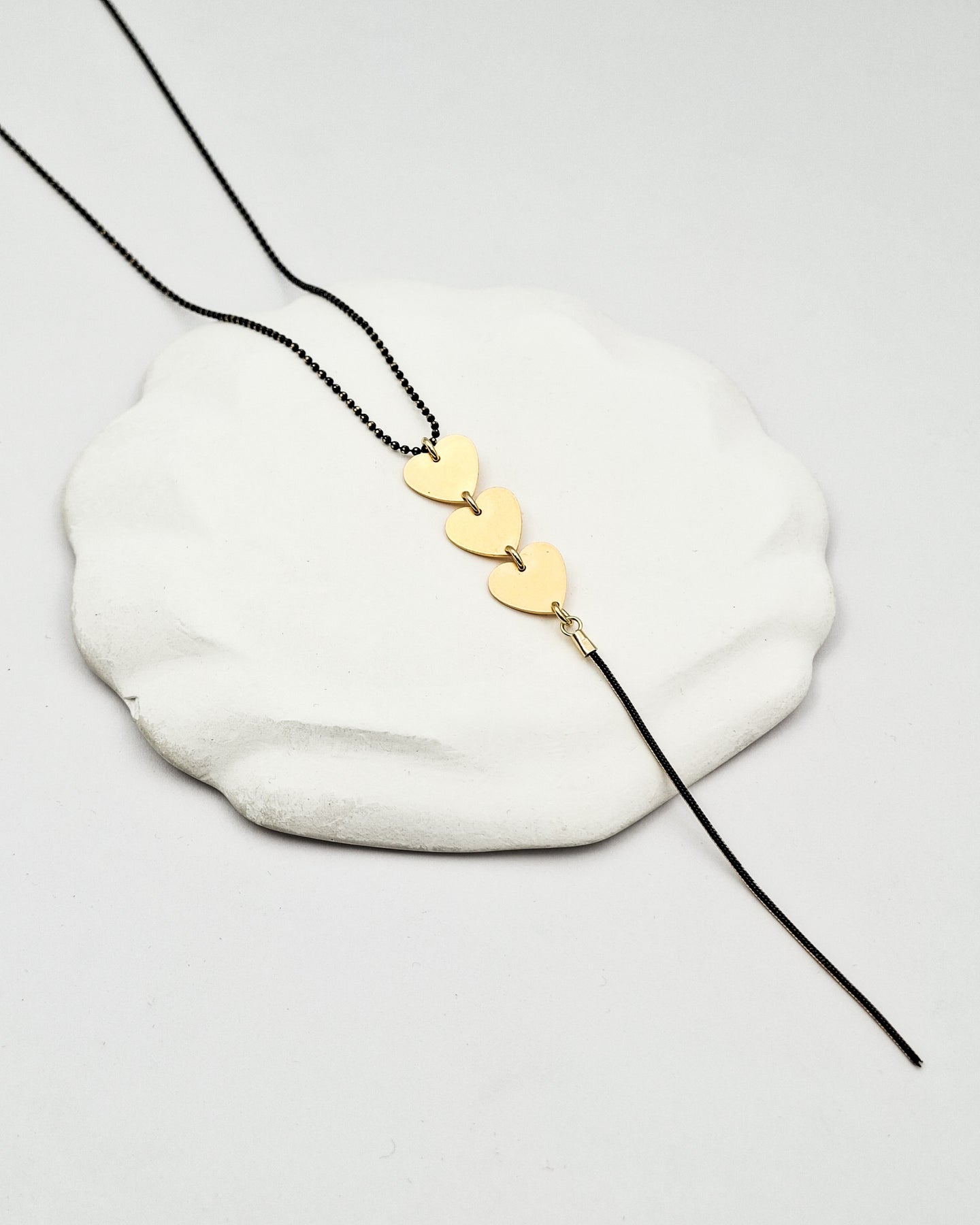 שרשרת כדורית ארוכה עדינה בציפוי אפור מנצנץ או שחור מנצנץ, לבחירתך ותליון המורכב משלושה אלמנטים בצורת לב ומתחתיהם "שרוך" מנצנץ. הפריט מגיע ארוז למתנה ועם אחריות לשנה. ניתן להוסיף ברכה אישית ופתק החלפה.