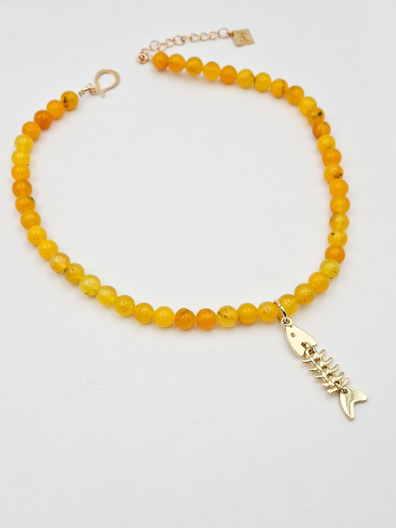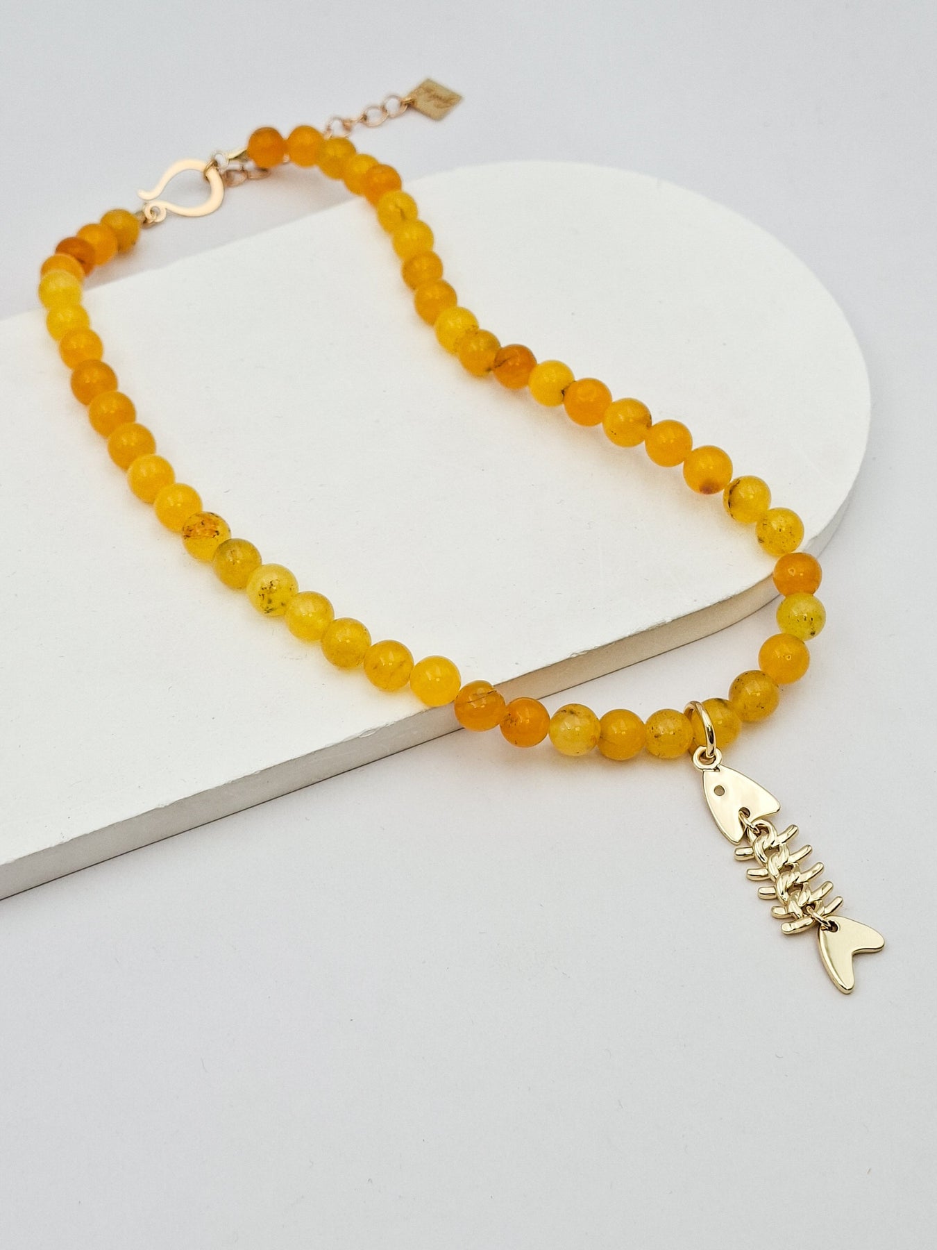 שרשרת קצרה מאבני קוורץ בגווני צהבהב קרמי בהיר ותליון בצורת אדרה של דג בעל תנועתיות הניתן להסרה. ניתן לענוד לבד או בשילוב שרשראות נוספות למראה שכבות. האלמנטים בשרשרת בציפוי ישראלי איכותי של זהב 24 קראט. הפריט מגיע ארוז למתנה ועם אחריות לשנה. ניתן להוסיף ברכה אישית ופתק החלפה.