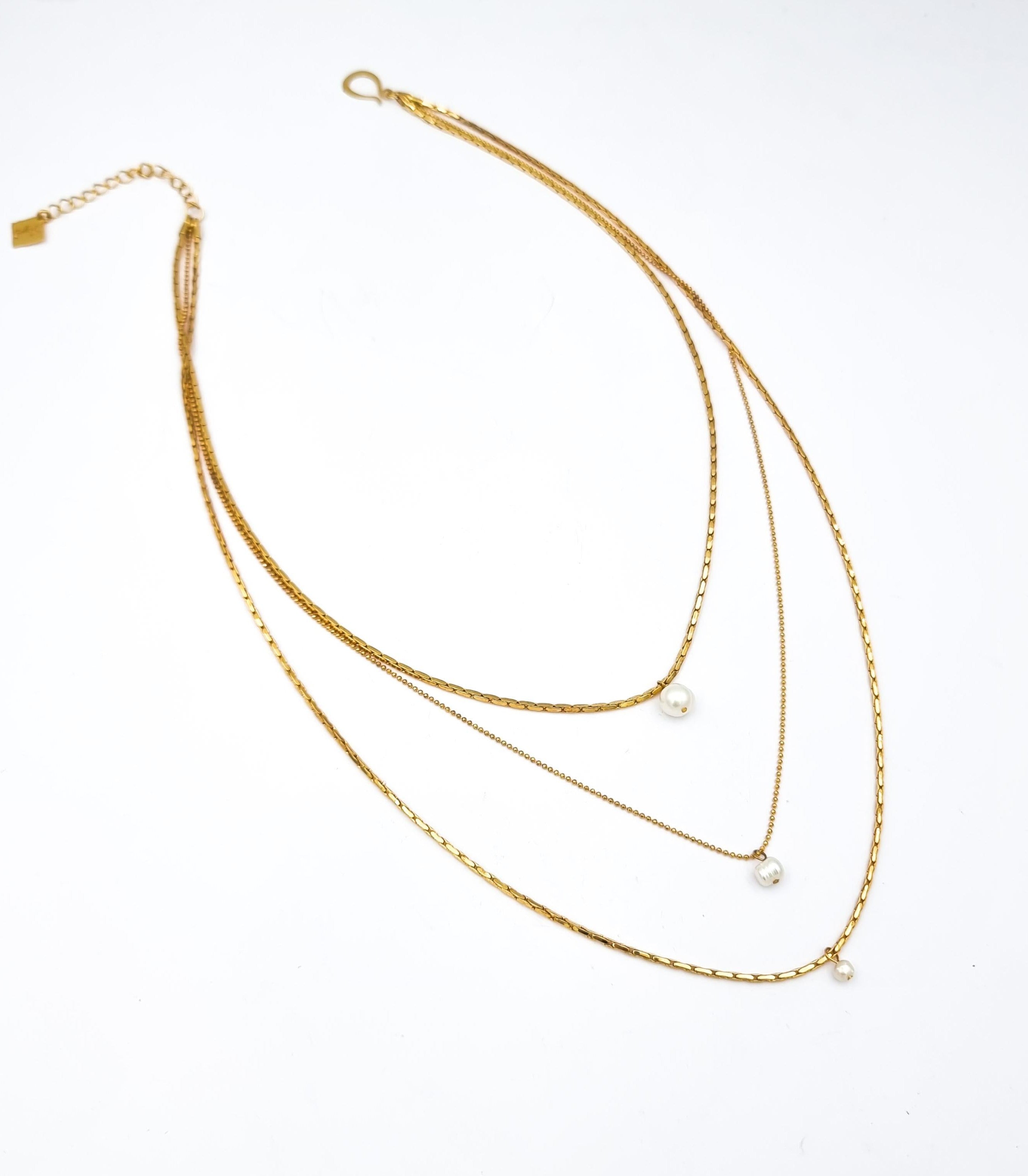 שרשרת מדורגת מרשימה בעיצוב מיוחד, עשויה 3 שרשרות בדוגמאות שונות ועל כל אחת מהן תליון פנינה אמתית.