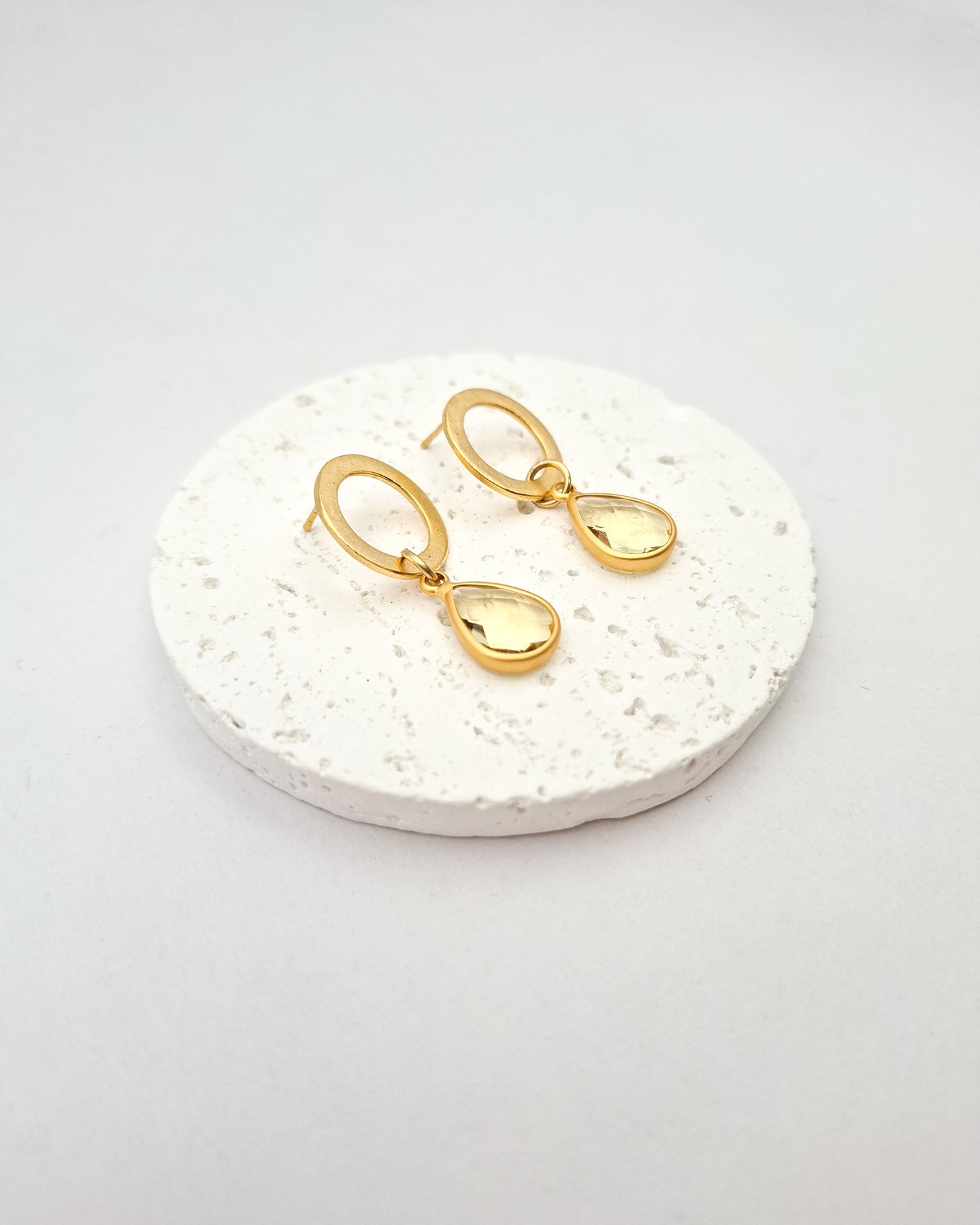 עגילים צמודים בצורת עיגול חלול ועליו תליון של קריסטל ממוסגר בצורת טיפה. העגילים בציפוי ישראלי איכותי של זהב 24 קראט. הפריט מגיע ארוז למתנה ועם אחריות לשנה. ניתן להוסיף ברכה אישית ופתק החלפה.