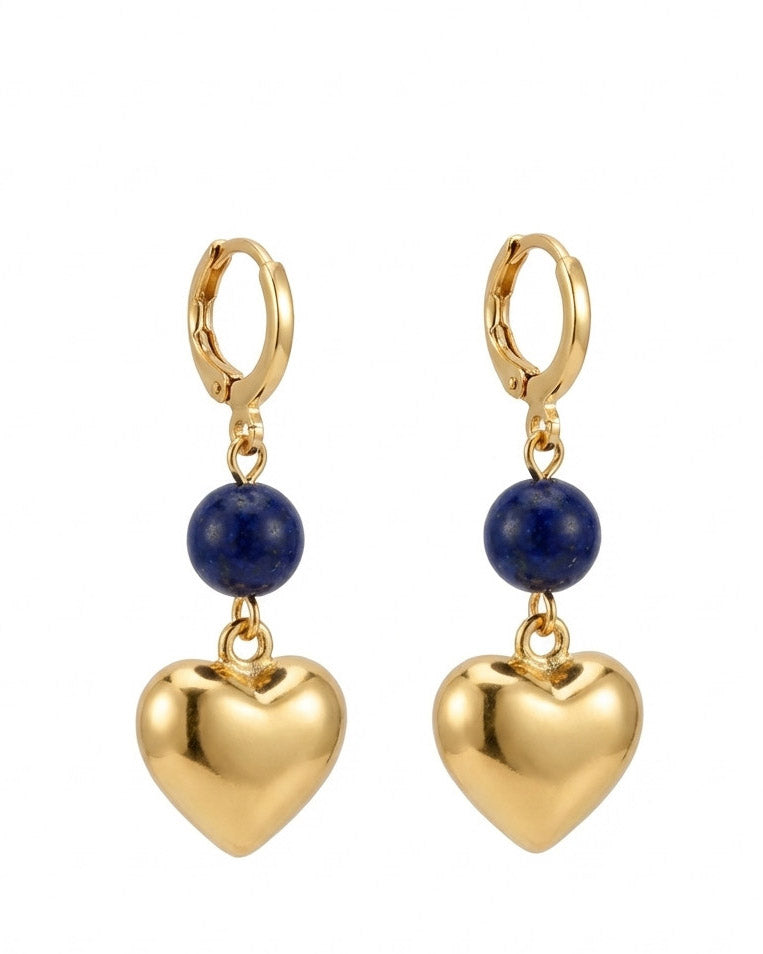 עגילי חישוק מדהימים עם תליון המורכב מאבן לאפיס אמיתית עגולה ואלמנט בצורת לב בעל נפח. העגילים בציפוי ישראלי איכותי של זהב 24 קראט ובגימור מט. בסיס העגיל בציפוי היפואלרגני. הפריט מגיע ארוז למתנה ועם אחריות לשנה. ניתן להוסיף ברכה אישית ופתק החלפה.