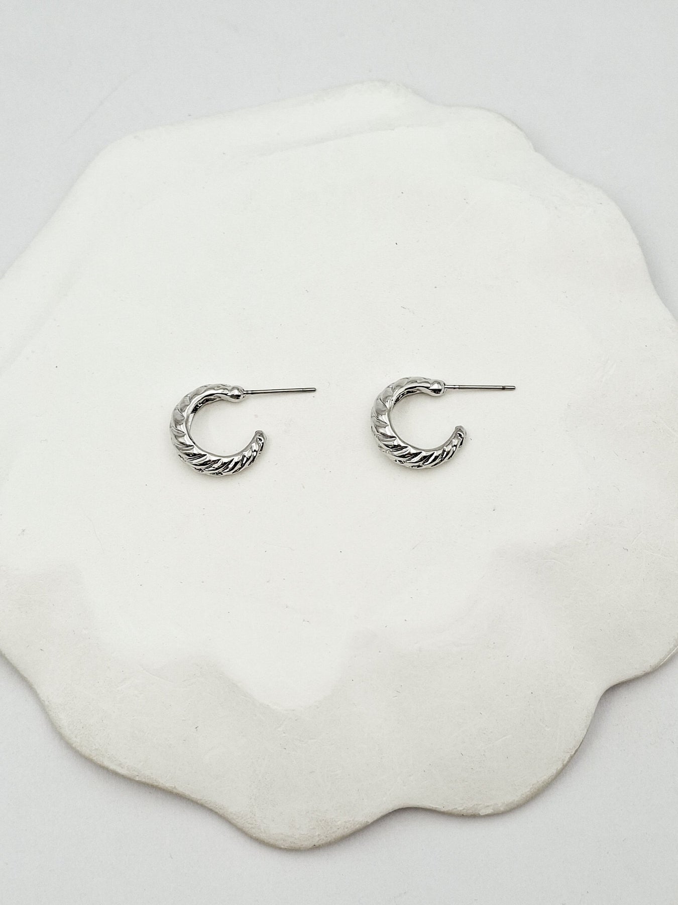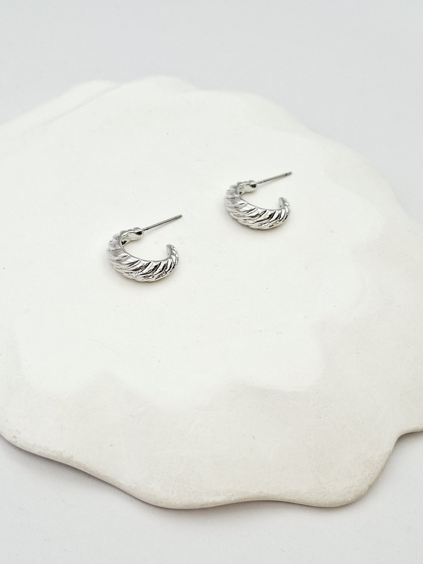 עגילי חישוק צמודים ועדינים בעלי טקסטורה של פסים מסובבים. העגילים בציפוי ישראלי איכותי של כסף היפואלרגני.