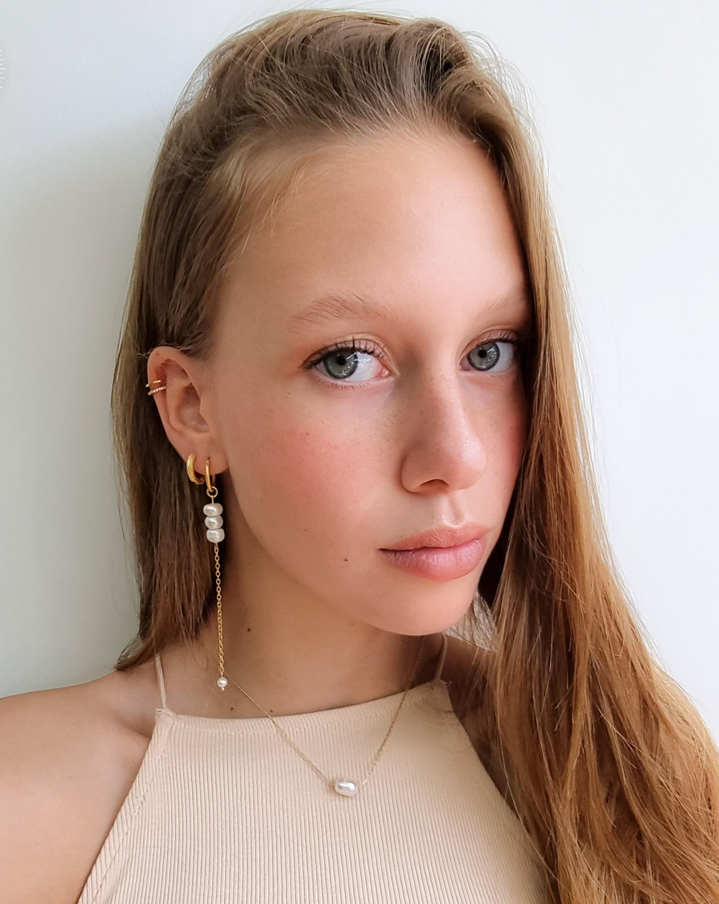 עגילי חישוק מהממים ועדינים אך בעלי נוכחות עם שלישיית פנינים צמודים בשילוב שרוך חוליות עם פנינה בתחתית, העגילים בציפוי איכותי ישראלי של זהב 24 קראט.