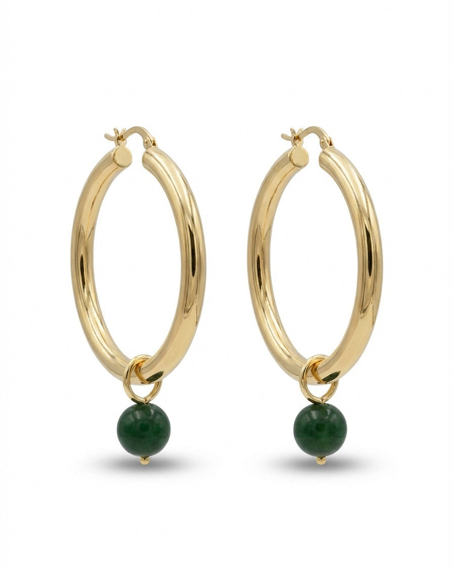 עגילי חישוק גדולים בעלי נפח עם תליון של אבן קוורץ עגולה בגוון ירוק. ניתן לענוד גם ללא התליון כחישוק "נקי" (או עגיל אחד עם ועגילי אחד בלי - באופן אסימטרי). העגילים בציפוי ישראלי איכותי והיפואלרגני של זהב 24 קראט. הפריט מגיע ארוז למתנה ועם אחריות לשנה. ניתן להוסיף ברכה אישית ופתק החלפה.