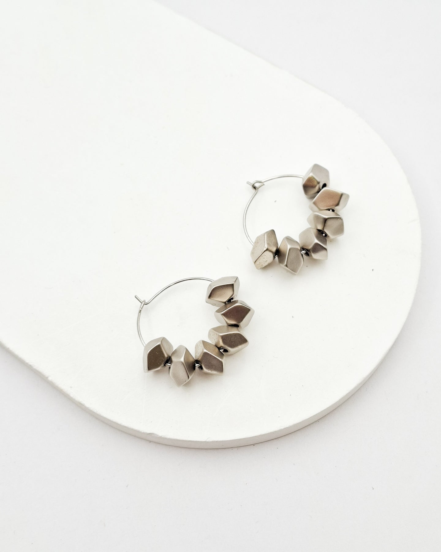 עגילי חישוק עם אלמנטים מסותתים בציפוי ישראלי איכותי של זהב 24 קראט או כסף, לבחירתך. תולה העגיל הינו היפואלרגני. הפריט מגיע ארוז למתנה ועם אחריות לשנה. ניתן להוסיף ברכה אישית ופתק החלפה.