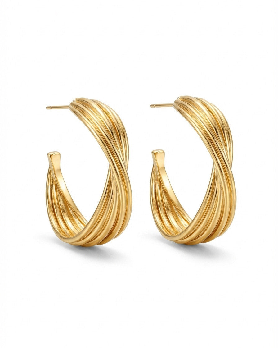 עגילי חישוק מרשימים עשויים מקבוצת חוטים מתלפפת. העגילים בציפוי ישראלי איכותי של זהב 24 קראט או כסף וקיימים בשני גדלים, לבחירתך. הפריט מגיע ארוז למתנה ועם אחריות לשנה. ניתן להוסיף ברכה אישית ופתק החלפה.