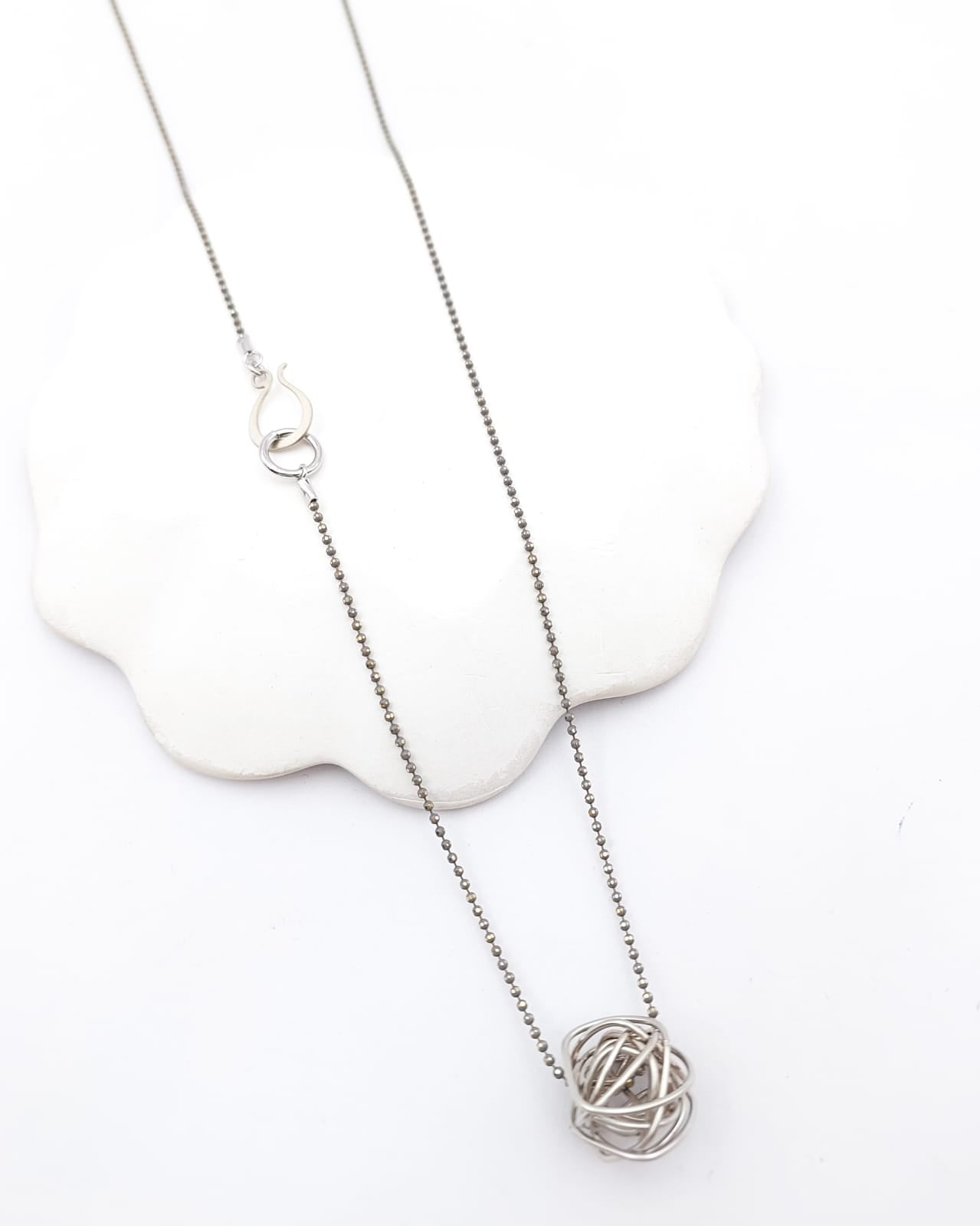 שרשרת כדוריות עדינה ועליה כדור סבך חוטים עשוי בעבודת יד. השרשרת בציפוי ישראלי איכותי של זהב 24 קראט/כסף/ אפור מנצנץ לבחירתך. הפריט מגיע ארוז למתנה ועם אחריות לשנה. ניתן להוסיף ברכה אישית ופתק החלפה.