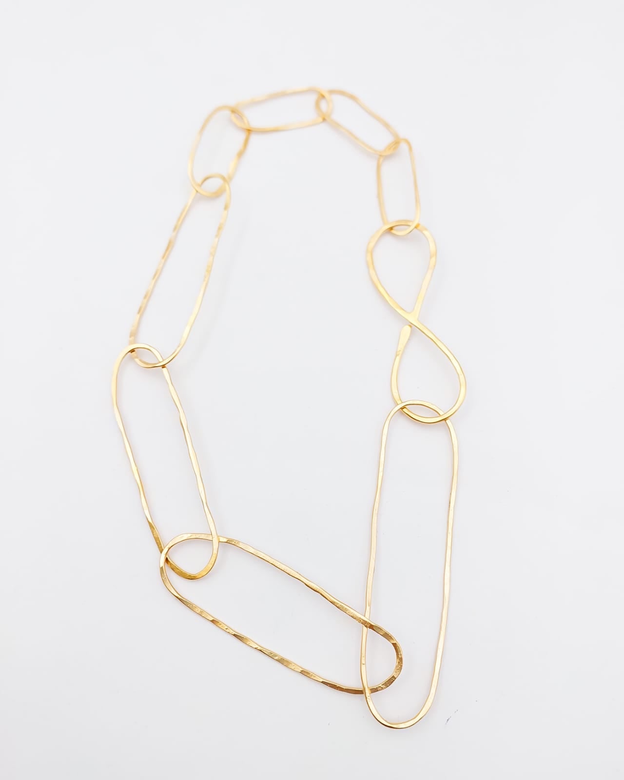 שרשרת קצרה ומיוחדת בעלת אלמנטים בצורת רצף לולאות אסימטריות בגדלים שונים עשויות בעבודת יד.
