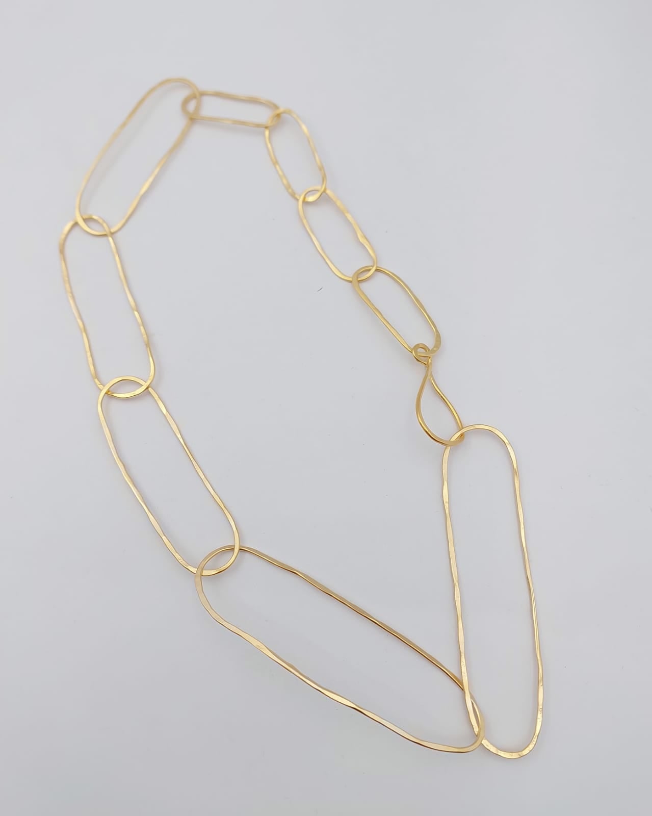 שרשרת קצרה ומיוחדת בעלת אלמנטים בצורת רצף לולאות אסימטריות בגדלים שונים עשויות בעבודת יד.