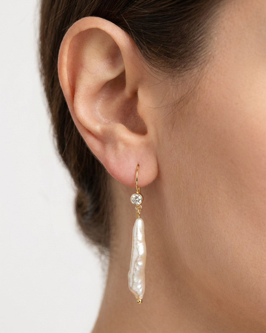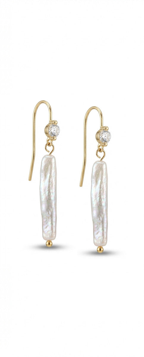 עגילים תלויים בשיבוץ זירקון עגול ותליון של פנינה אמיתית ארוכה. העגילים בציפוי ישראלי איכותי והיפואלרגני של זהב 24 קראט. הפנינים אמתיות ולכן צורתן משתנה מעגיל לעגיל. הפריט מגיע ארוז למתנה ועם אחריות לשנה. ניתן להוסיף ברכה אישית ופתק החלפה