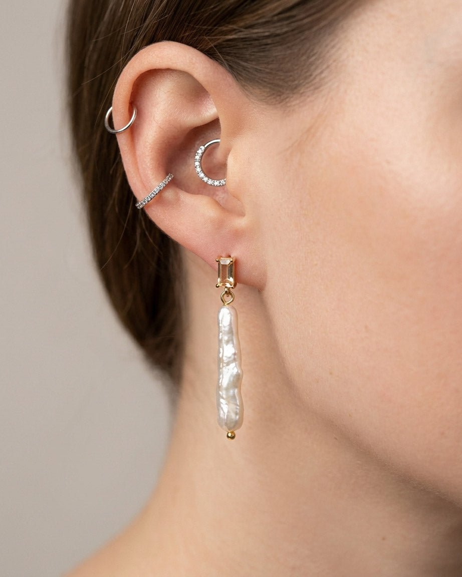 עגילים תלויים עם בסיס צמוד בשיבוץ זירקון בצורת מלבן ותליון של פנינה אמיתית ארוכה. העגילים בציפוי ישראלי איכותי והיפואלרגני של זהב 24 קראט או כסף, לבחירתך. הפריט מגיע ארוז למתנה ועם אחריות לשנה. ניתן להוסיף ברכה אישית ופתק החלפה