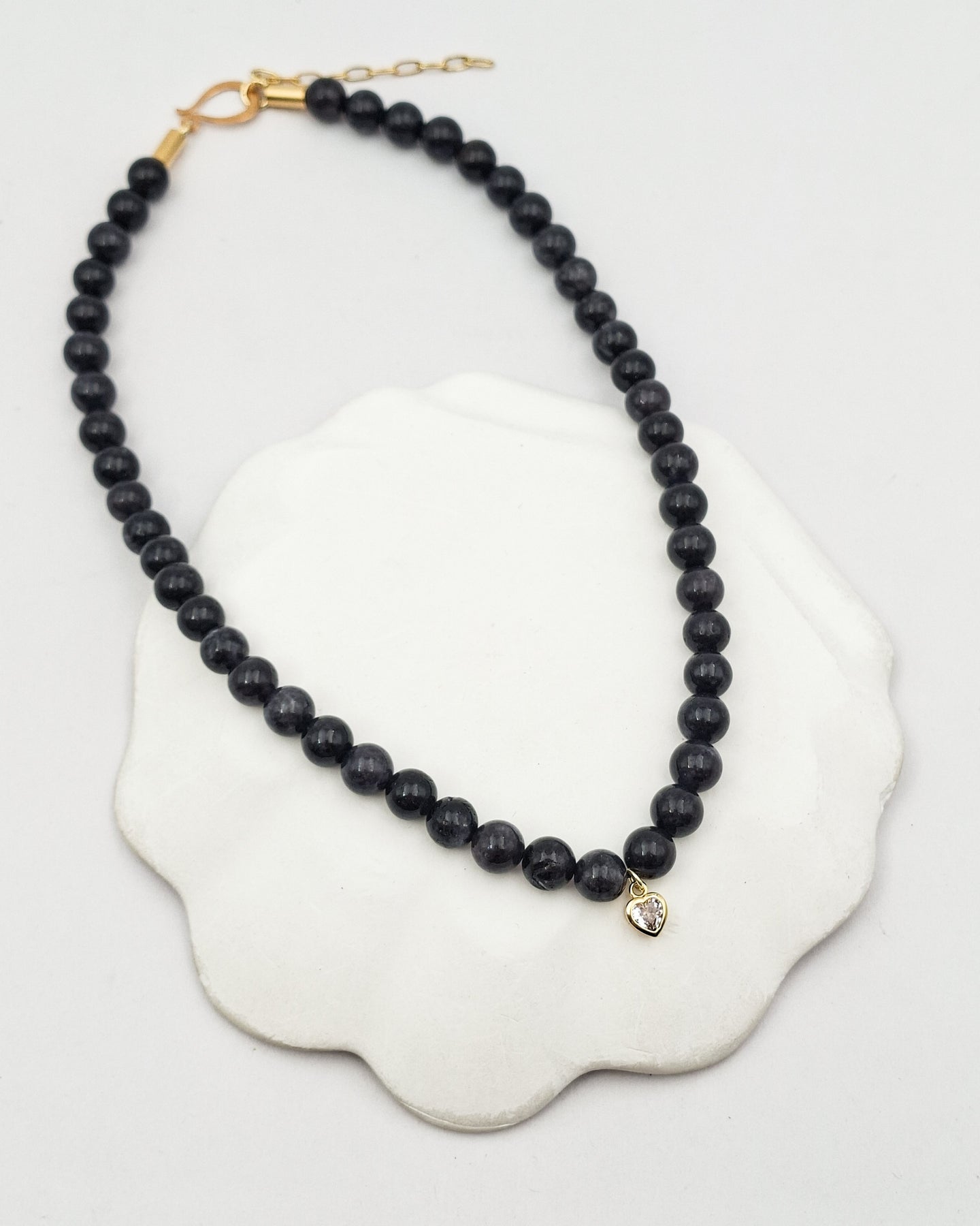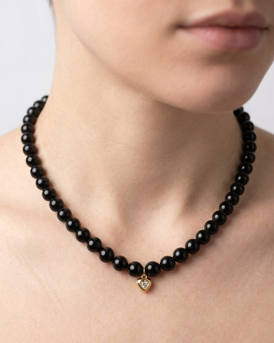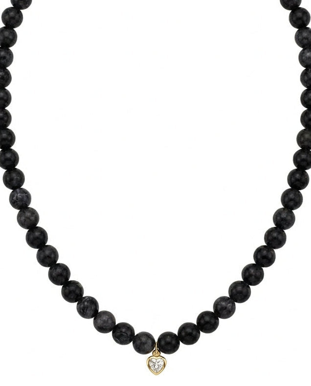 שרשרת אבני חן אמתיות בגוון שחור אפרפר עם תליון של זירקון בצורת לב ממוסגר. בציפוי ישראלי איכותי של זהב 24 קראט. הפריט מגיע ארוז למתנה ועם אחריות לשנה. ניתן להוסיף ברכה אישית ופתק החלפה.