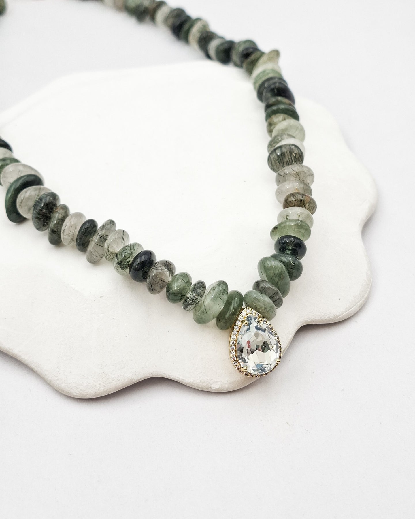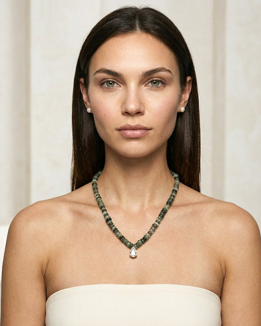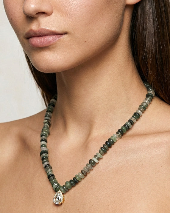 שרשרת אבנים אמתיות בגוונים של ירקרק עם תליון של טיפה ומסגרת זירקונים. בציפוי ישראלי איכותי של זהב 24 קראט. הפריט מגיע ארוז למתנה ועם אחריות לשנה. ניתן להוסיף ברכה אישית ופתק החלפה.