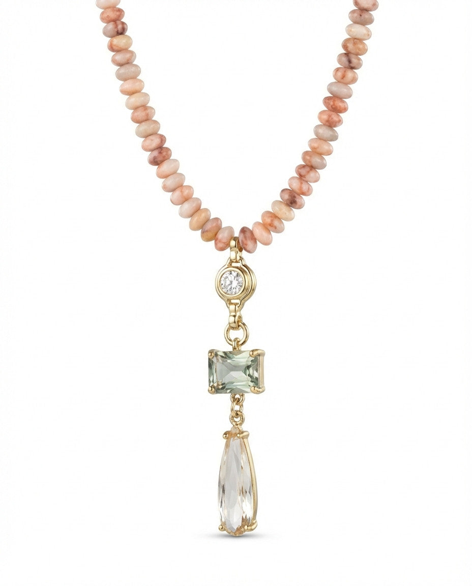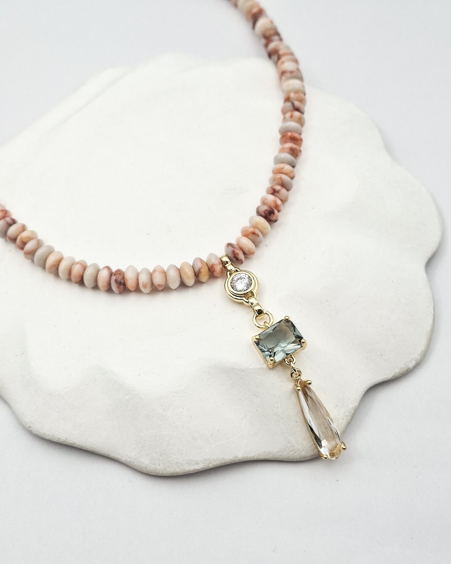 שרשרת קצרה מאבנים טבעיות בגווני קרם עם תליון מקסים משובץ זירקונים בצורות שונות ובגוונים שקוף ואפרפר. האלמנטים בשרשרת בציפוי ישראלי איכותי והיפואלרגני של זהב 24 קראט. הפריט מגיע ארוז למתנה ועם אחריות לשנה. ניתן להוסיף ברכה אישית ופתק החלפה.