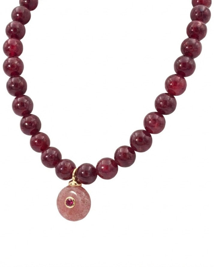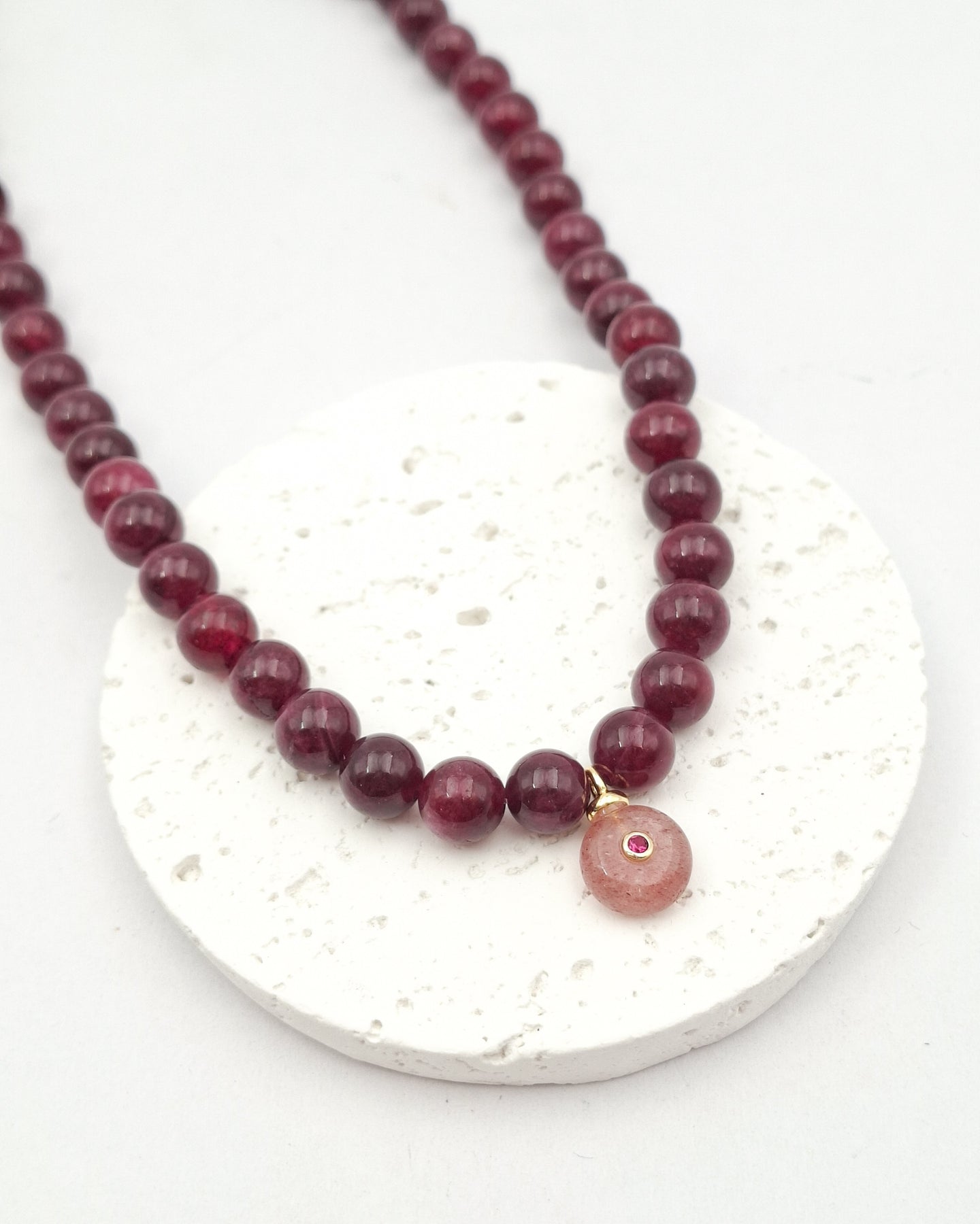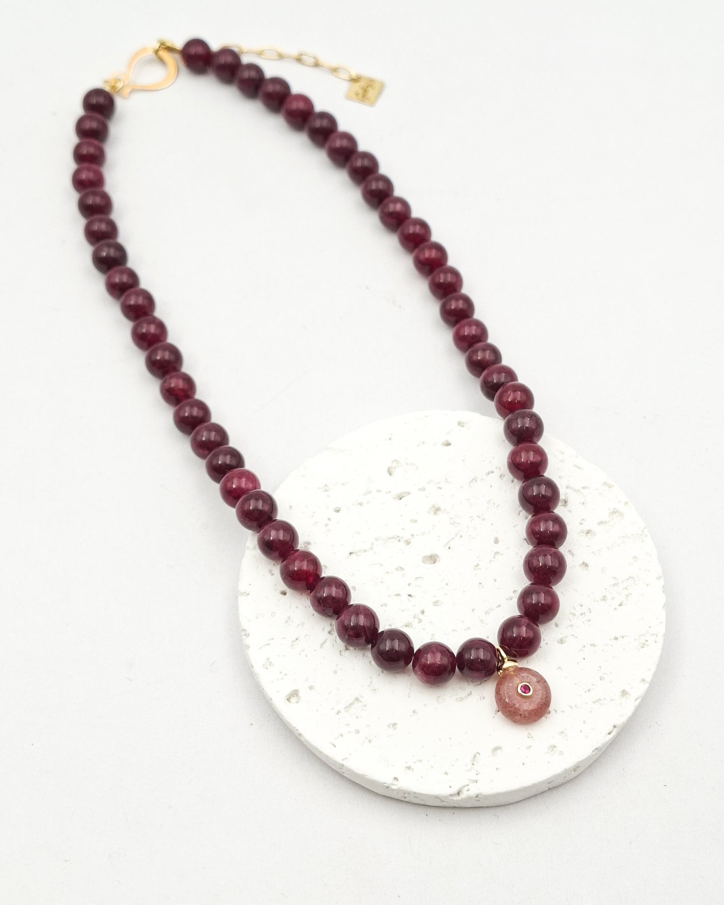 שרשרת אבני חן אמתיות בגוון בורדו עמוק עם תליון של אבן בגוון ורוד עתיק בשיבוץ זירקון קטן ורוד. בציפוי ישראלי איכותי של זהב 24 קראט. הפריט מגיע ארוז למתנה ועם אחריות לשנה. ניתן להוסיף ברכה אישית ופתק החלפה.