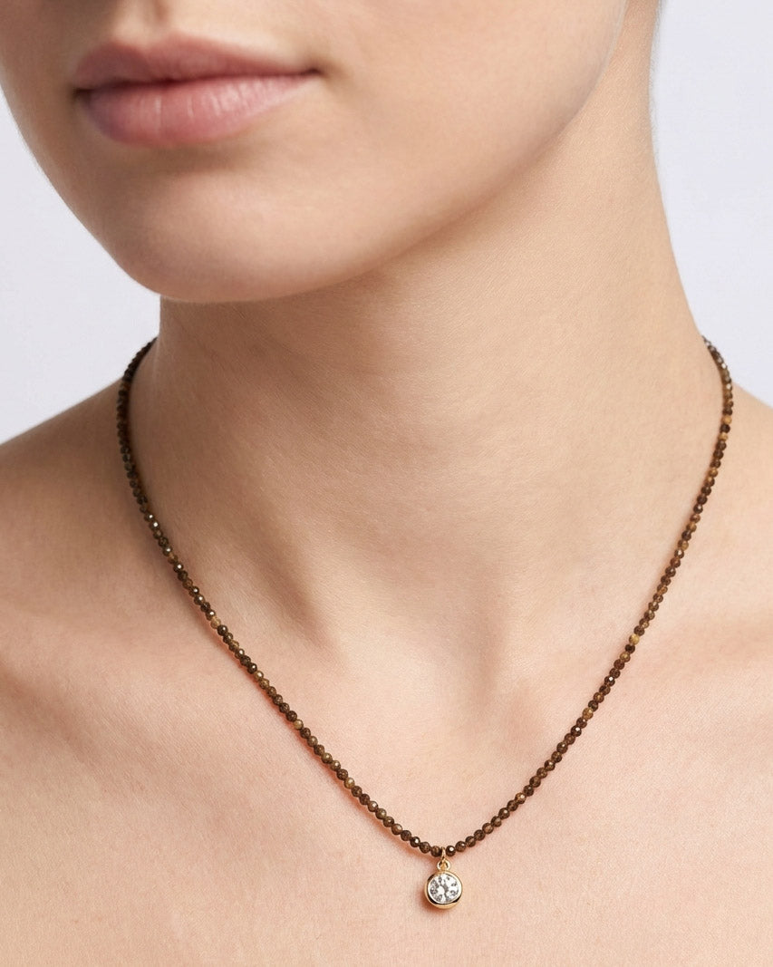 שרשרת אבני חן אמתיות קטנטנות עם תליון של קריסטל עגול ממוסגר. בציפוי ישראלי איכותי של זהב 24 קראט. הפריט מגיע ארוז למתנה ועם אחריות לשנה. ניתן להוסיף ברכה אישית ופתק החלפה.