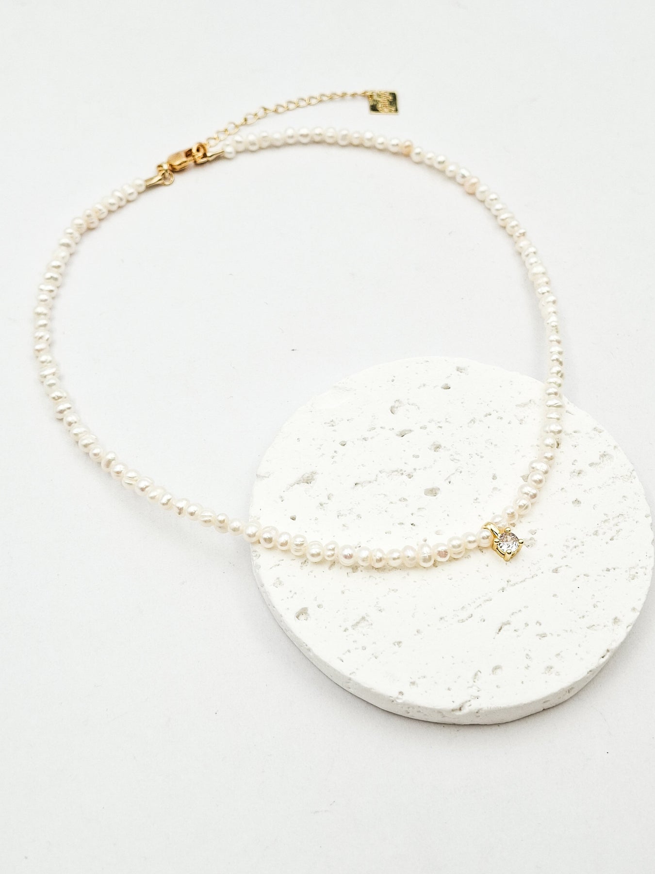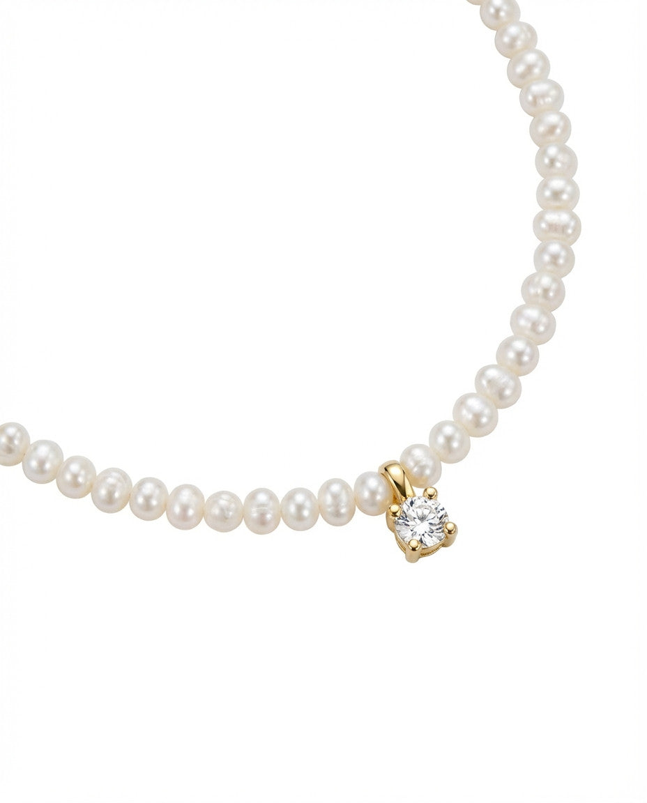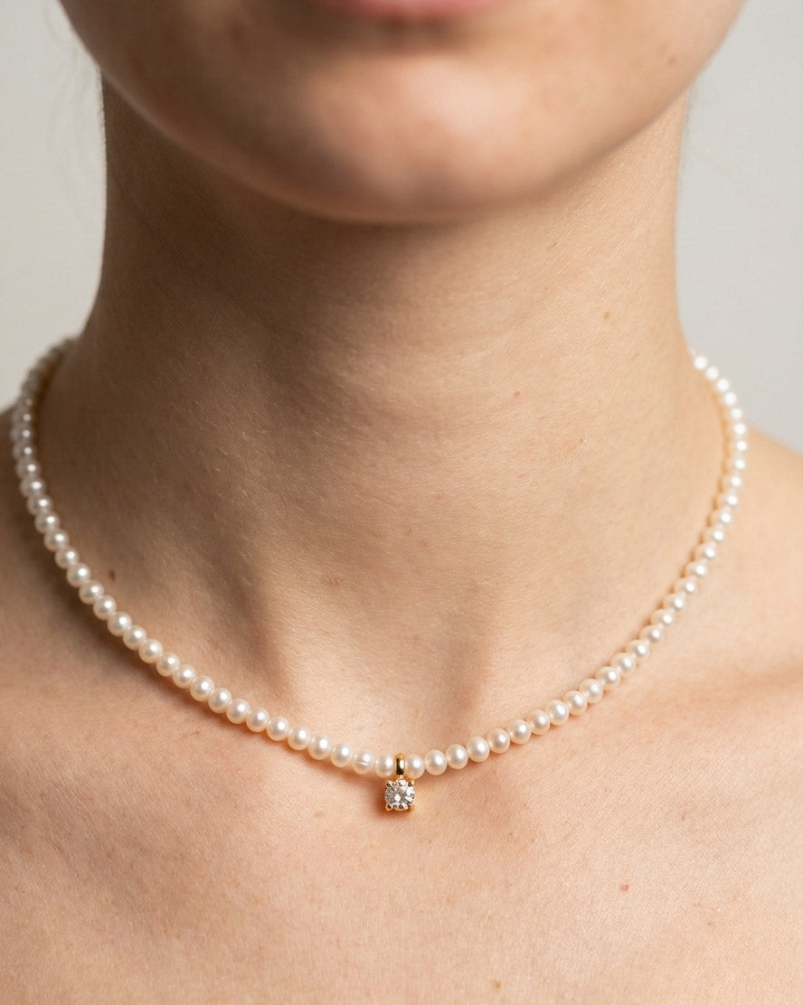 שרשרת קצרה של פנינים אמתיות קטנות עם תליון מרכזי של זירקון מרובע קטן. השרשרת בציפוי ישראלי איכותי של זהב 24 קראט. הפריט מגיע ארוז למתנה ועם אחריות לשנה. ניתן להוסיף ברכה אישית ופתק החלפה.