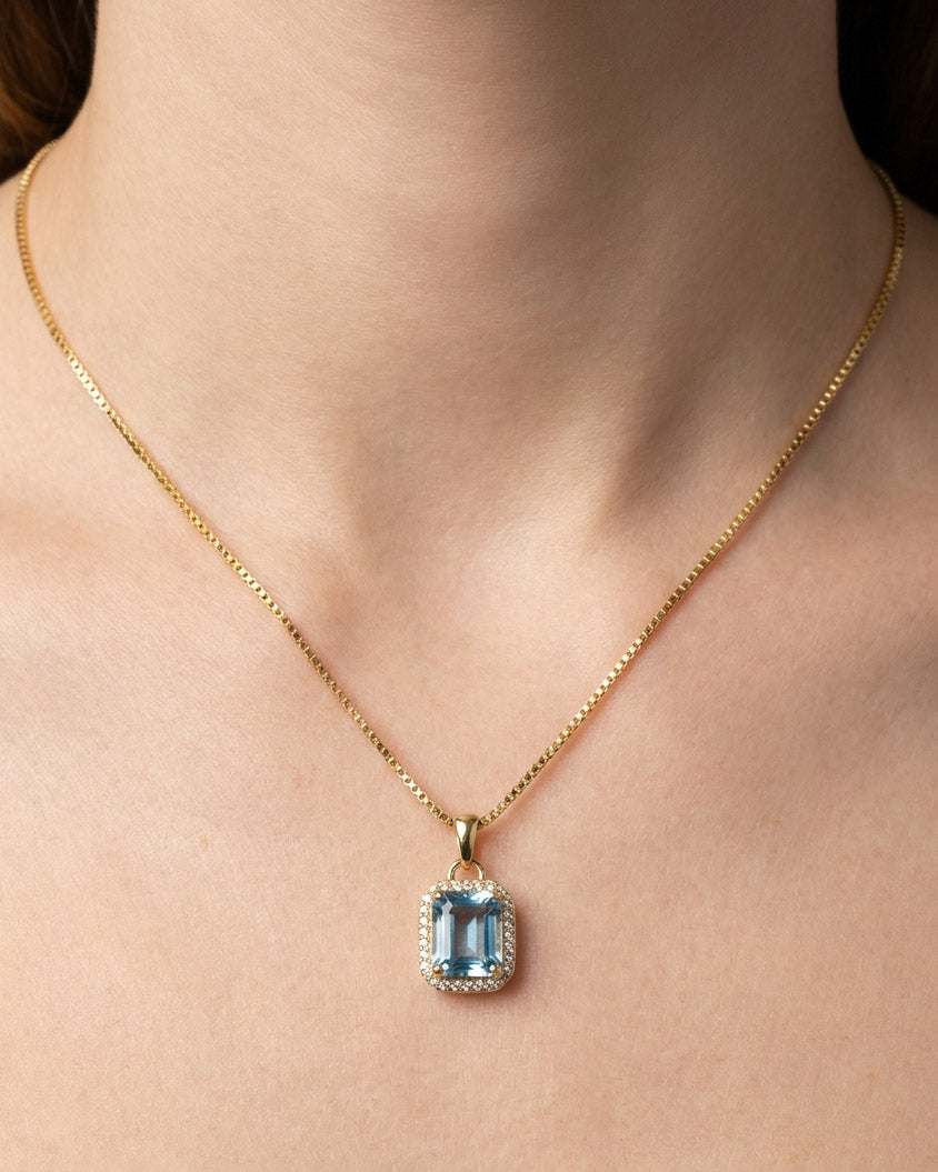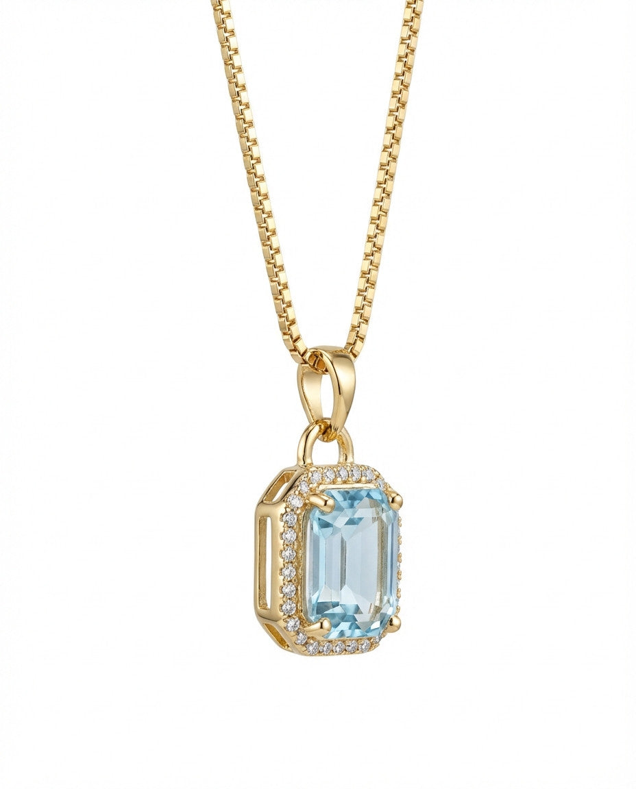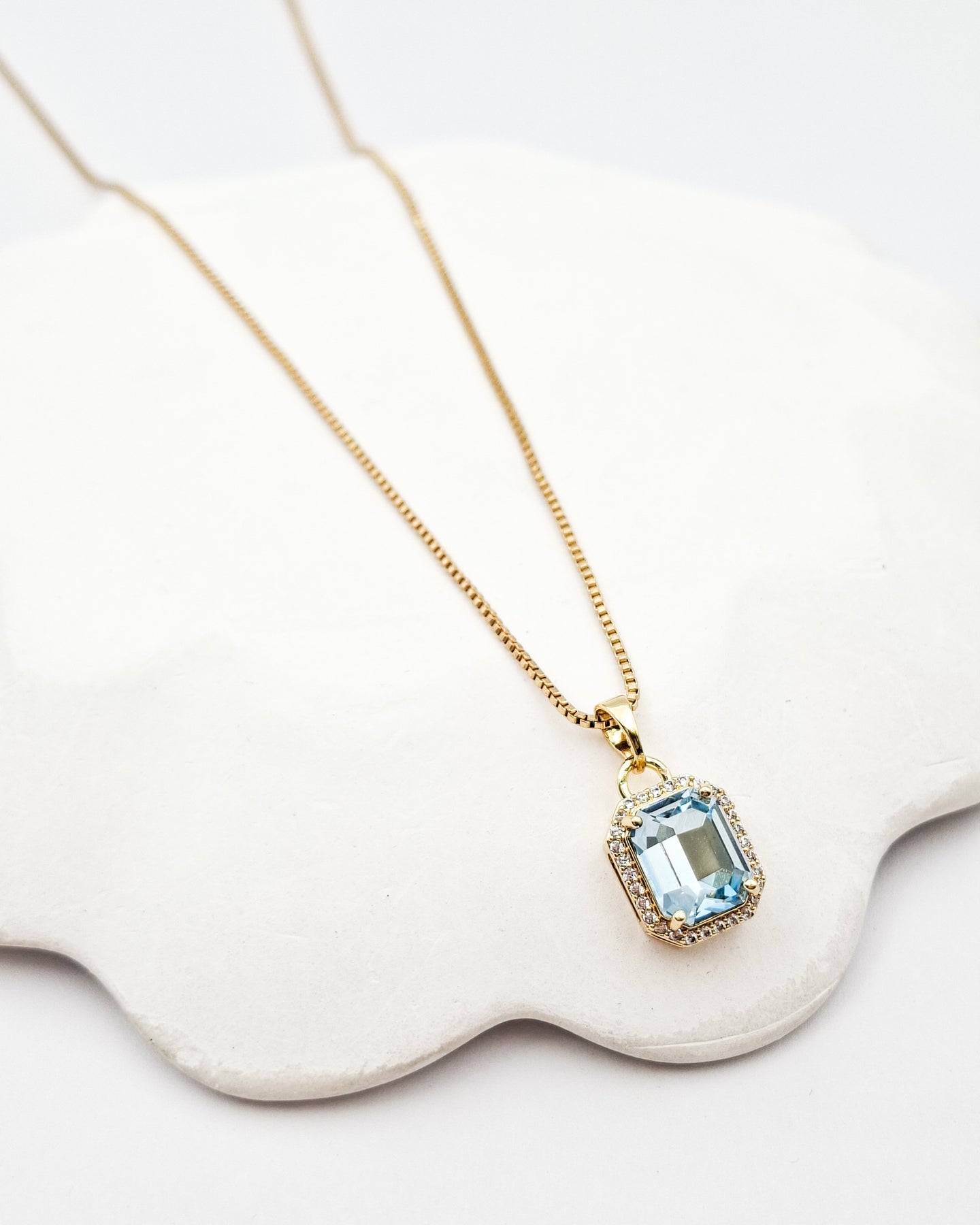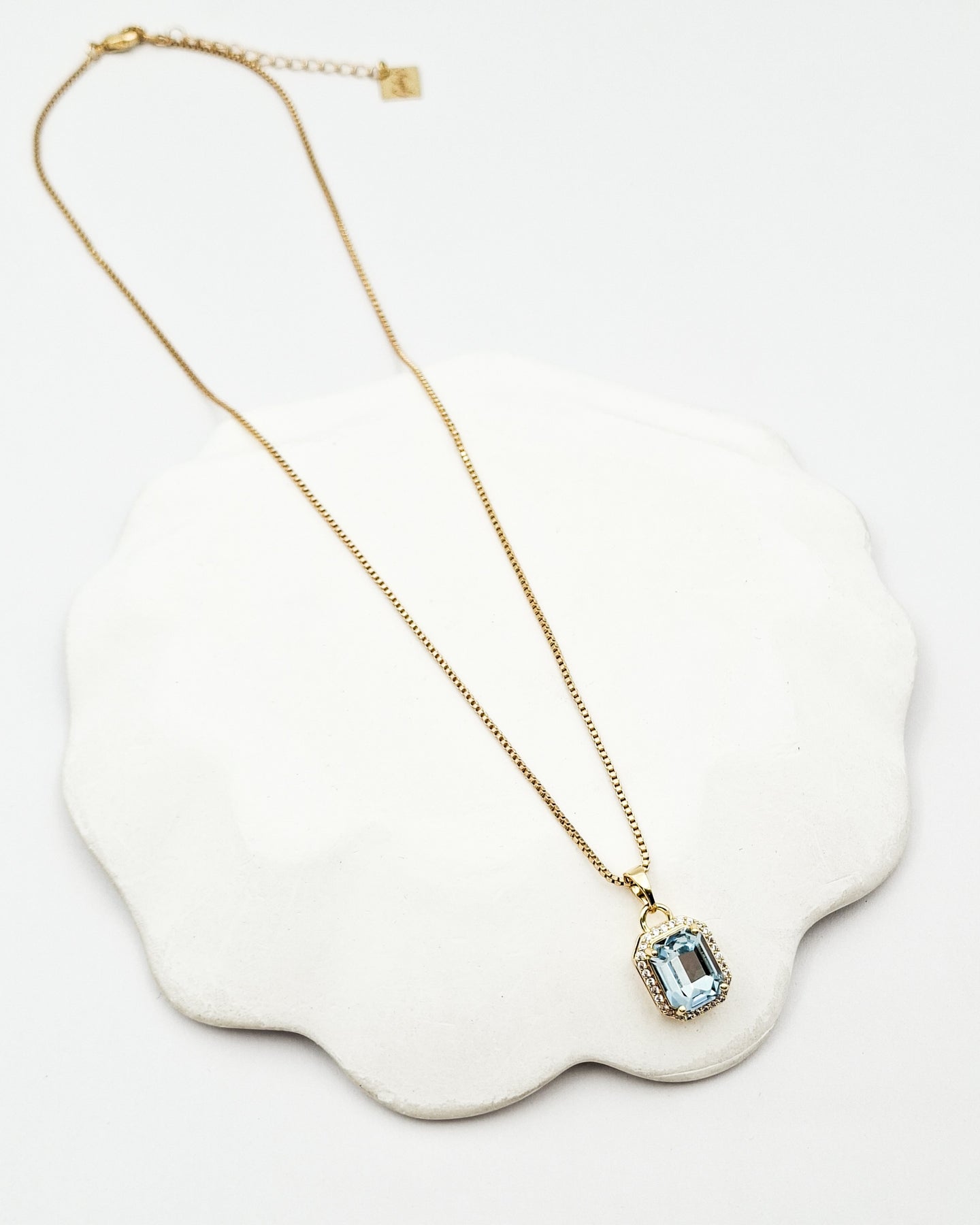 שרשרת קצרה עם תליון של קריסטל בגוון תכלת ומסגרת זירקונים קטנים שקופים . השרשרת בציפוי ישראלי איכותי של זהב 24 קארט היפואלרגני. הפריט מגיע ארוז למתנה ועם אחריות לשנה. ניתן להוסיף ברכה אישית ופתק החלפה.