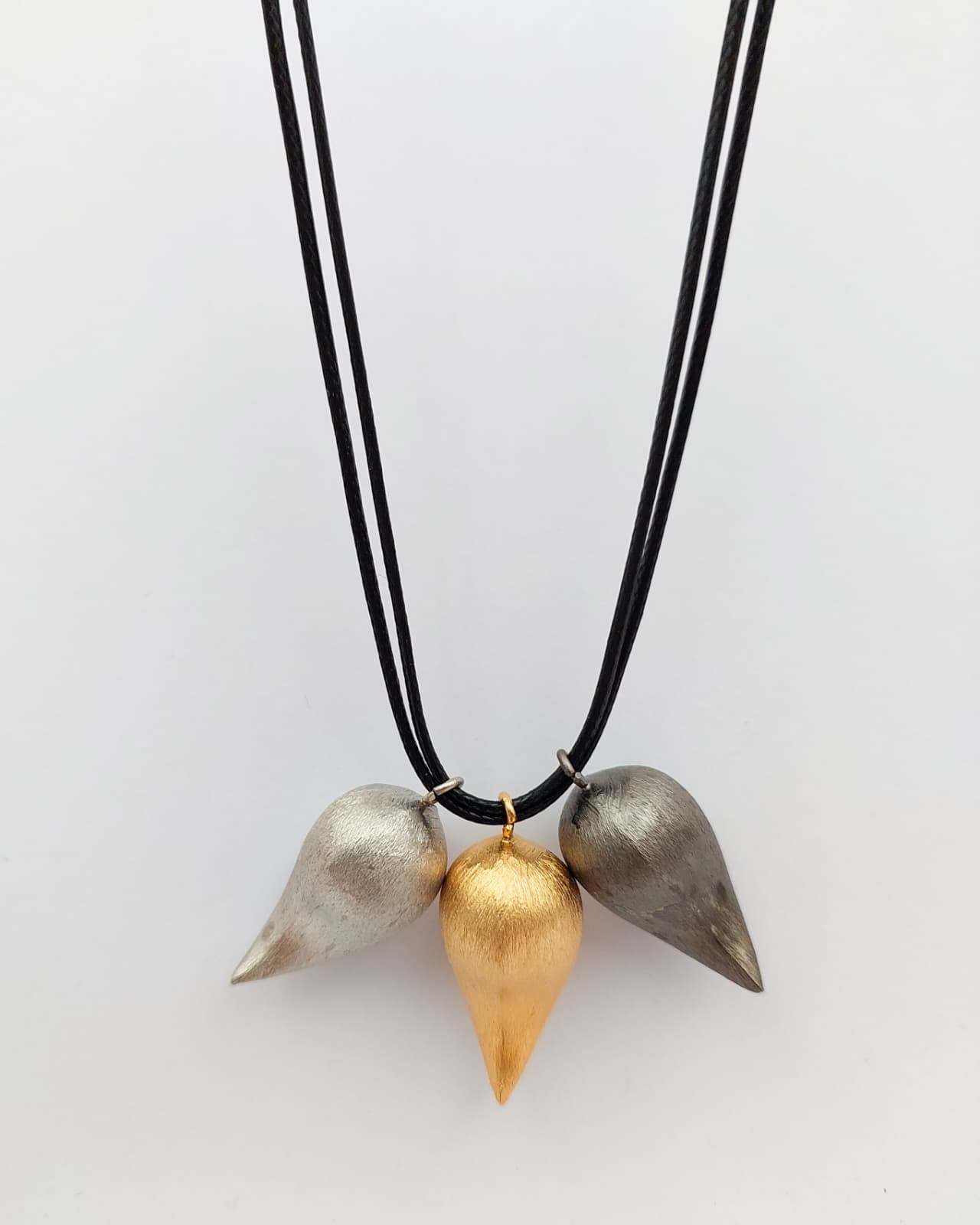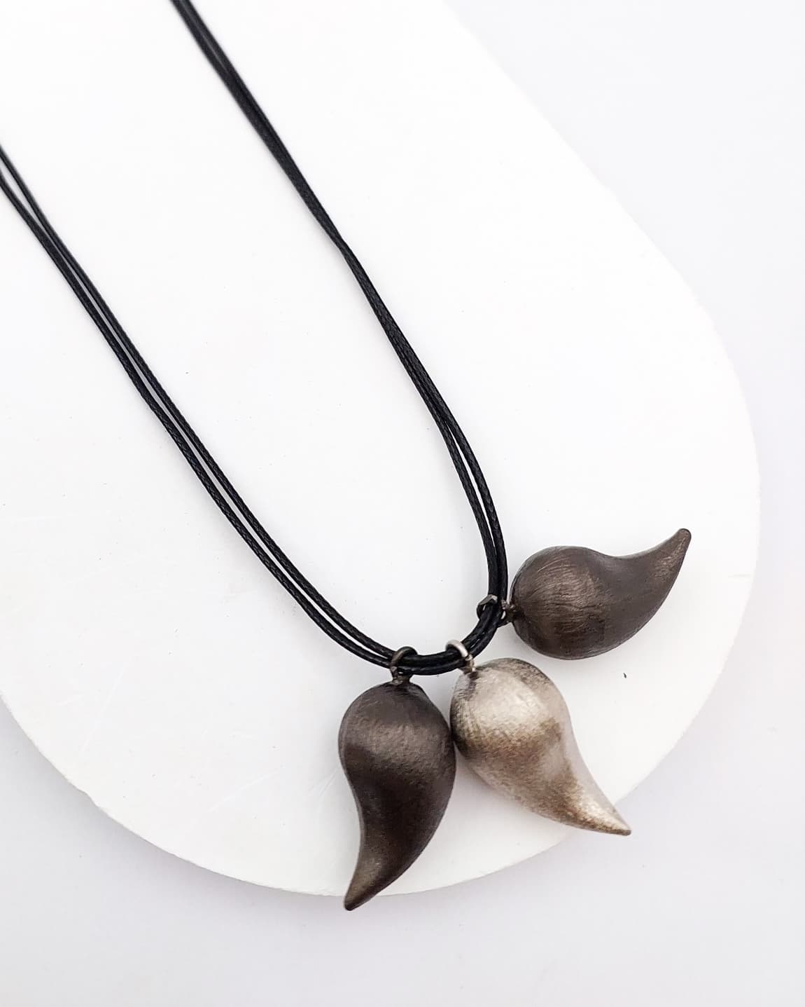 שרשרת ארוכה ומרשימה בעלת נוכחות אך קלת משקל, עשויה חוטי כותנה שחורים ועליו תליון של אלמנטים בצורת טיפות נפח בעלות טקסטורה מוברשת. השרשרת מגיעה בשילוב ציפויים שונים לבחירתך. בציפוי איכותי ישראלי של כסף, זהב 24 קראט ואפור כהה.