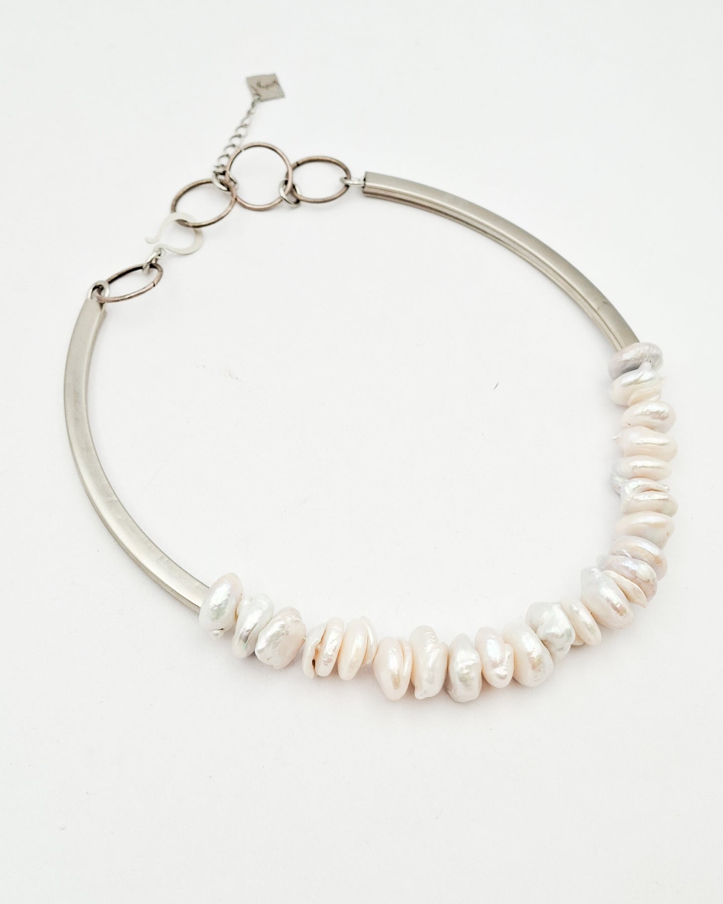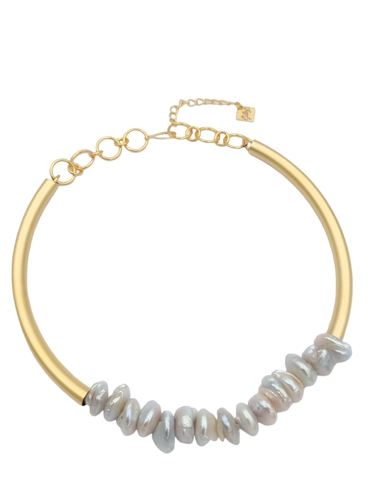 שרשרת קצרה מיוחדת במינה עשויה רצף פנינים אמתיות פראיות שבצדן שני אלמנטים בציפוי איכותי ישראלי של זהב 24 קראט או כסף, לבחירתך, וסוגר המורכב ממספר לולאות.