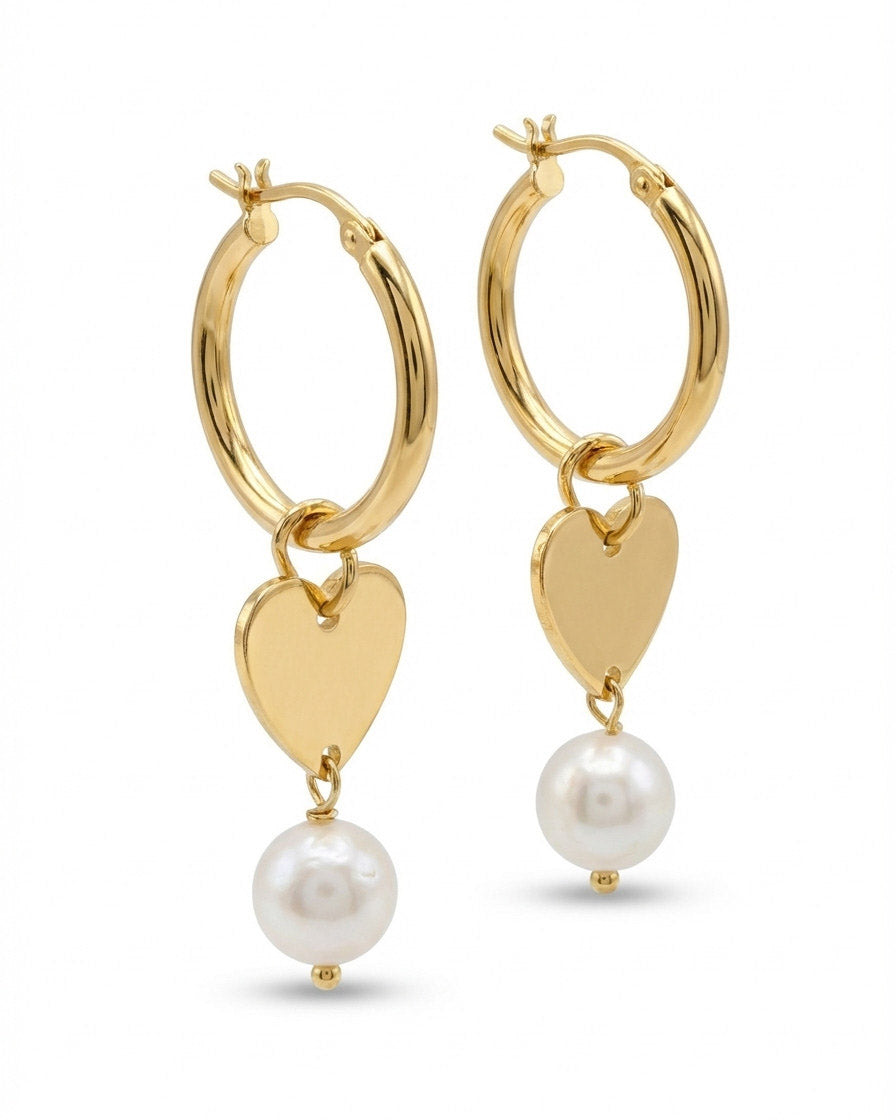 עגילי חישוק עם תליון בצורת לב ופנינה אמיתית. ניתן לענוד גם ללא הלב והפנינה כחישוק "נקי".