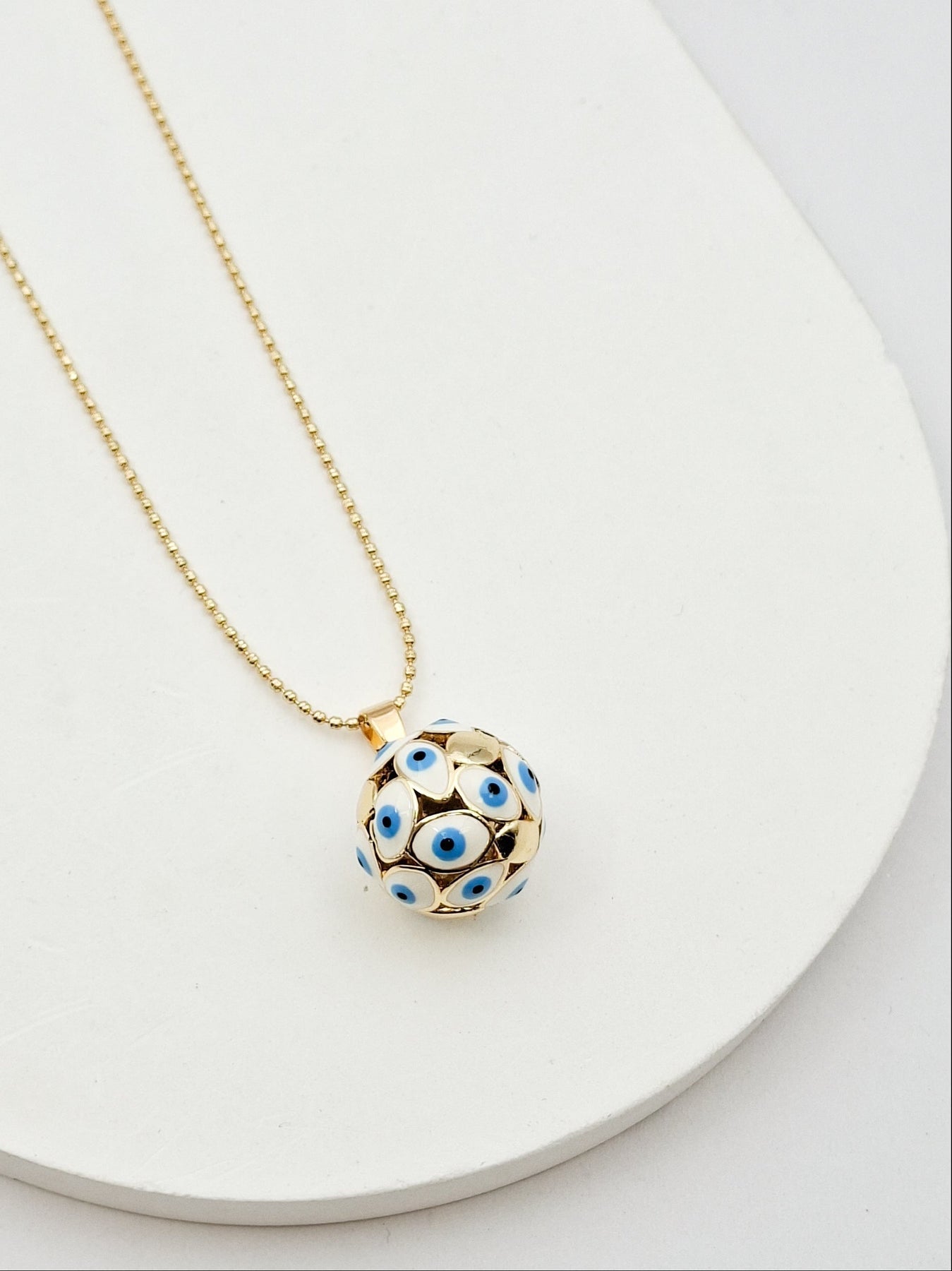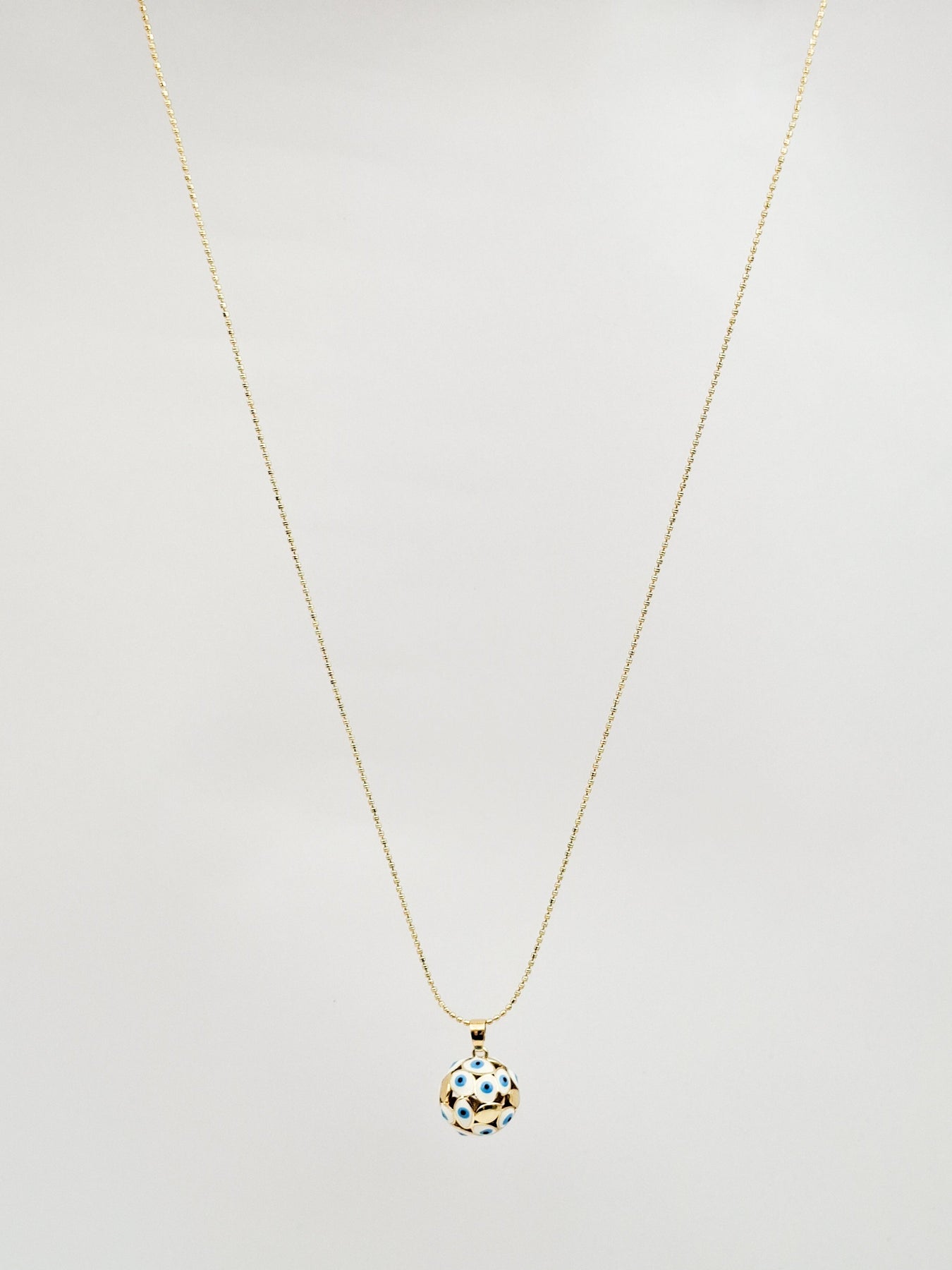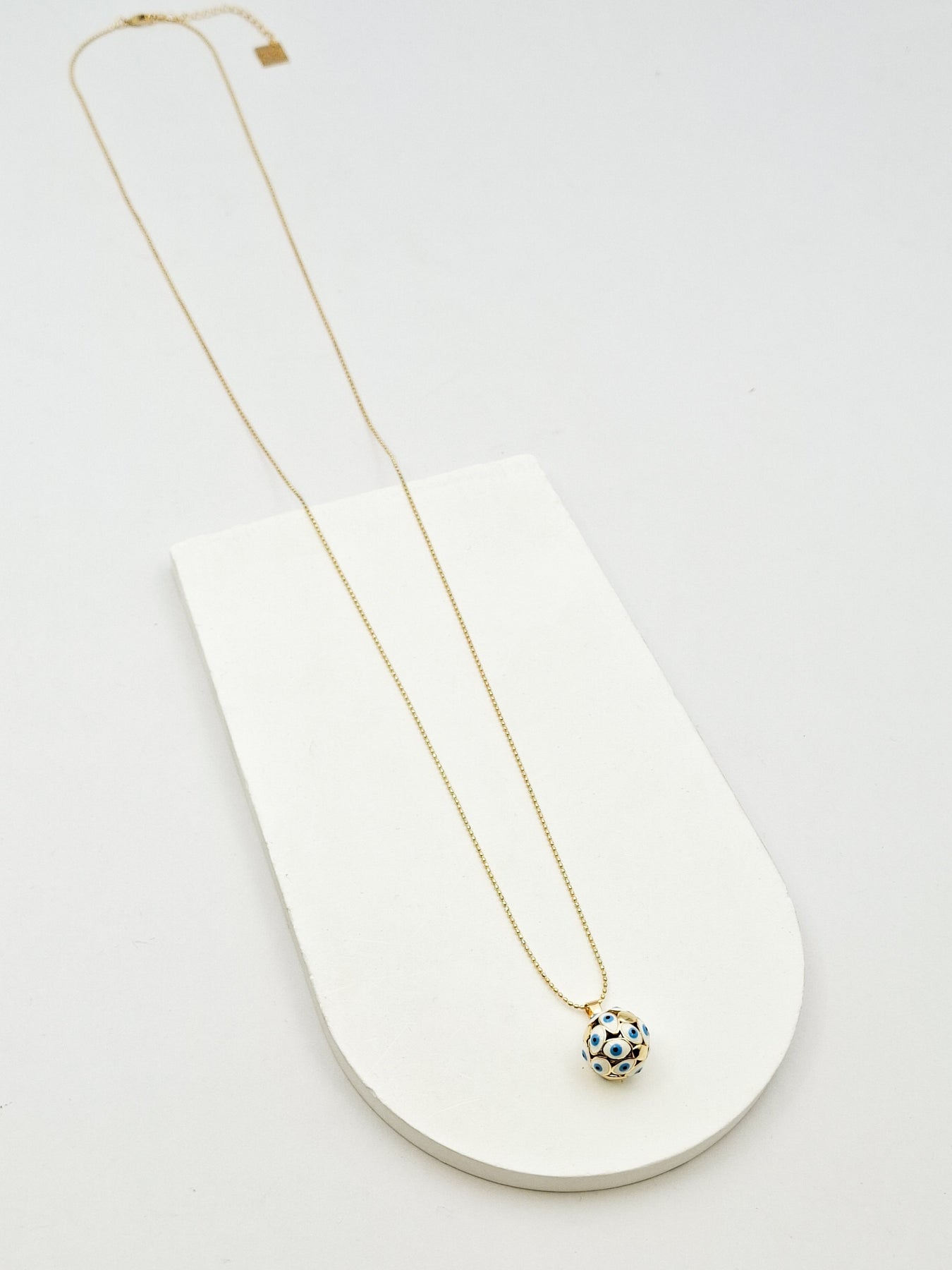 שרשרת כדורית ארוכה המשלבת תליון בצורת כדור עם עיניים מאמייל.
