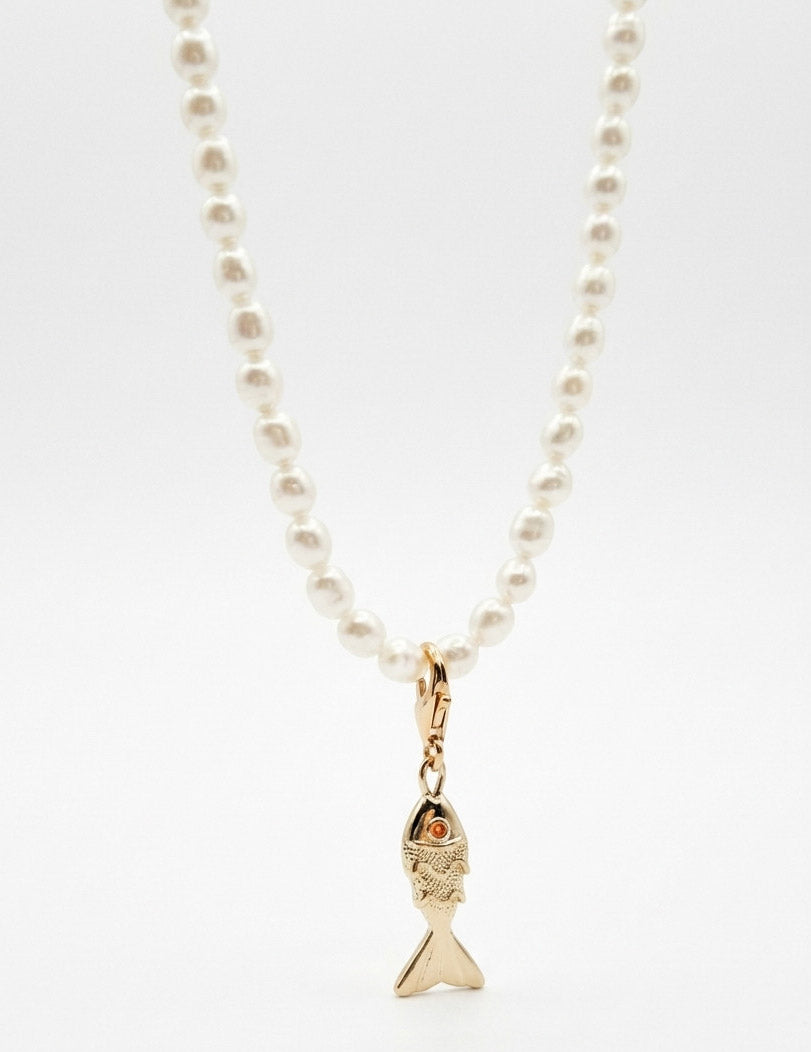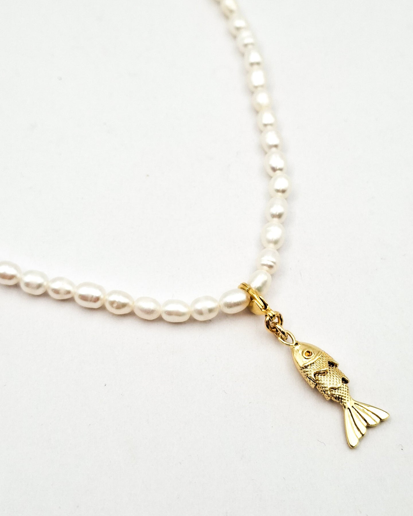 שרשרת פנינים אמתיות קצרה, עדינה ומהממת עם תליון נשלף של דג קטן בעל תנועתיות. ניתן לענוד עם או בלי התליון, לבד או בשילוב שרשראות נוספות למראה שכבות. האלמנטים בשרשרת בציפוי ישראלי איכותי של זהב 24 קראט. הפריט מגיע ארוז למתנה ועם אחריות לשנה. ניתן להוסיף ברכה אישית ופתק החלפה.