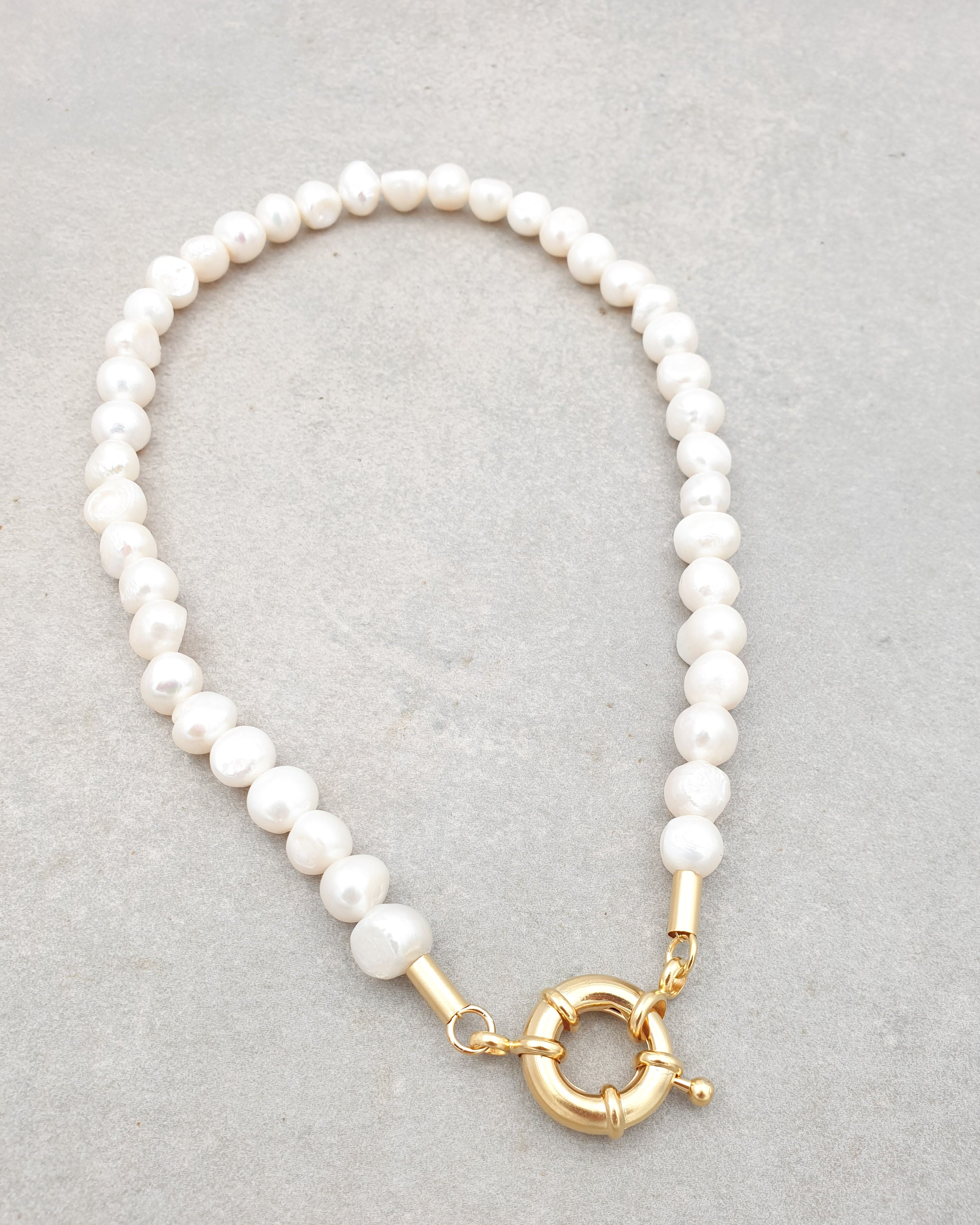 שרשרת פנינים אמתיות קצרה בעלת נוכחות וסוגר מרשים . השרשרת בציפוי ישראלי איכותי של זהב 24 קראט או כסף, לבחירתך. הפריט מגיע ארוז למתנה ועם אחריות לשנה. ניתן להוסיף ברכה אישית ופתק החלפה.