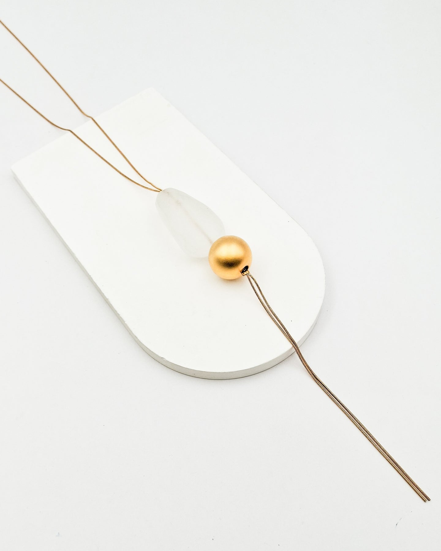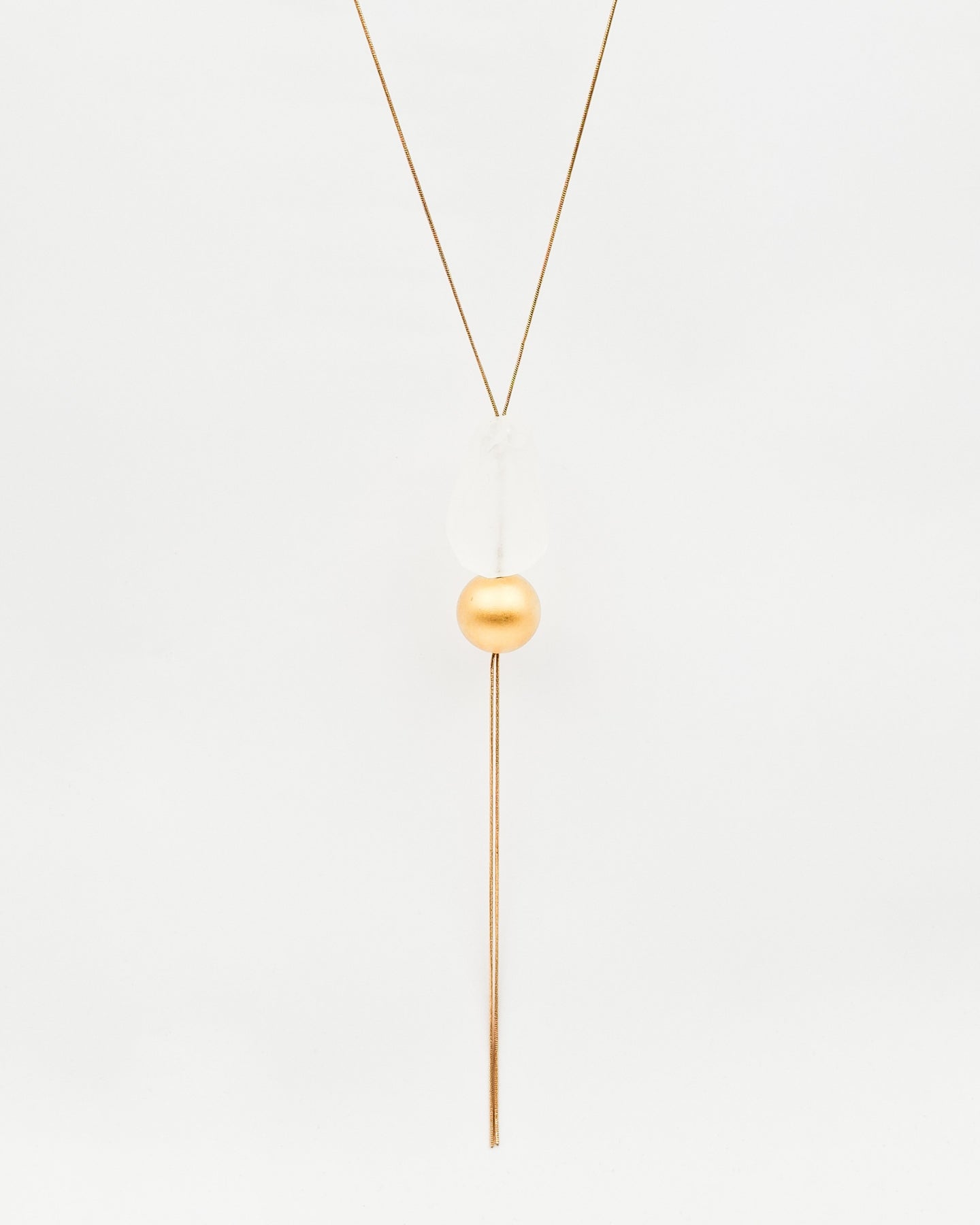 שרשרת עניבה ארוכה עדינה ומקסימה, מורכבת משרשרת עם אלמנט בצורת כדור ואלמנט אקרילי חלבי מוארך. השרשרת בציפוי זהב ישראלי איכותי של זהב 24 קראט.