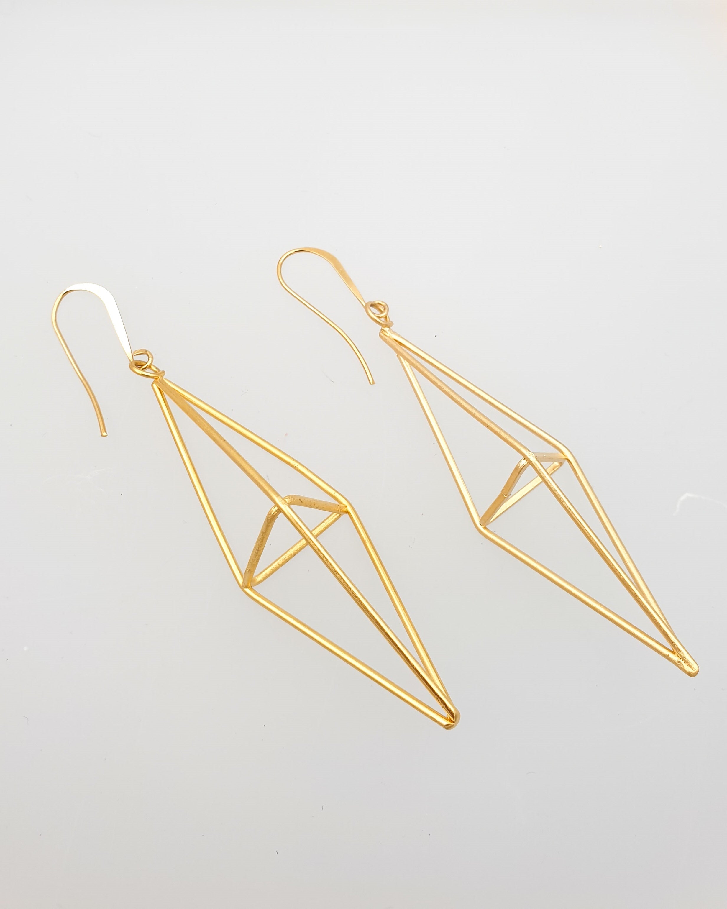 עגילים גאומטריים ארוכים ומקסימים בצורות משולשות היוצרות נפח תלת מימדי. העגילים בציפוי ישראלי איכותי של זהב 24 קראט או כסף , לבחירתך. תולה העגיל הינו היפואלרגני. הפריט מגיע ארוז למתנה ועם אחריות לשנה. ניתן להוסיף ברכה אישית ופתק החלפה.