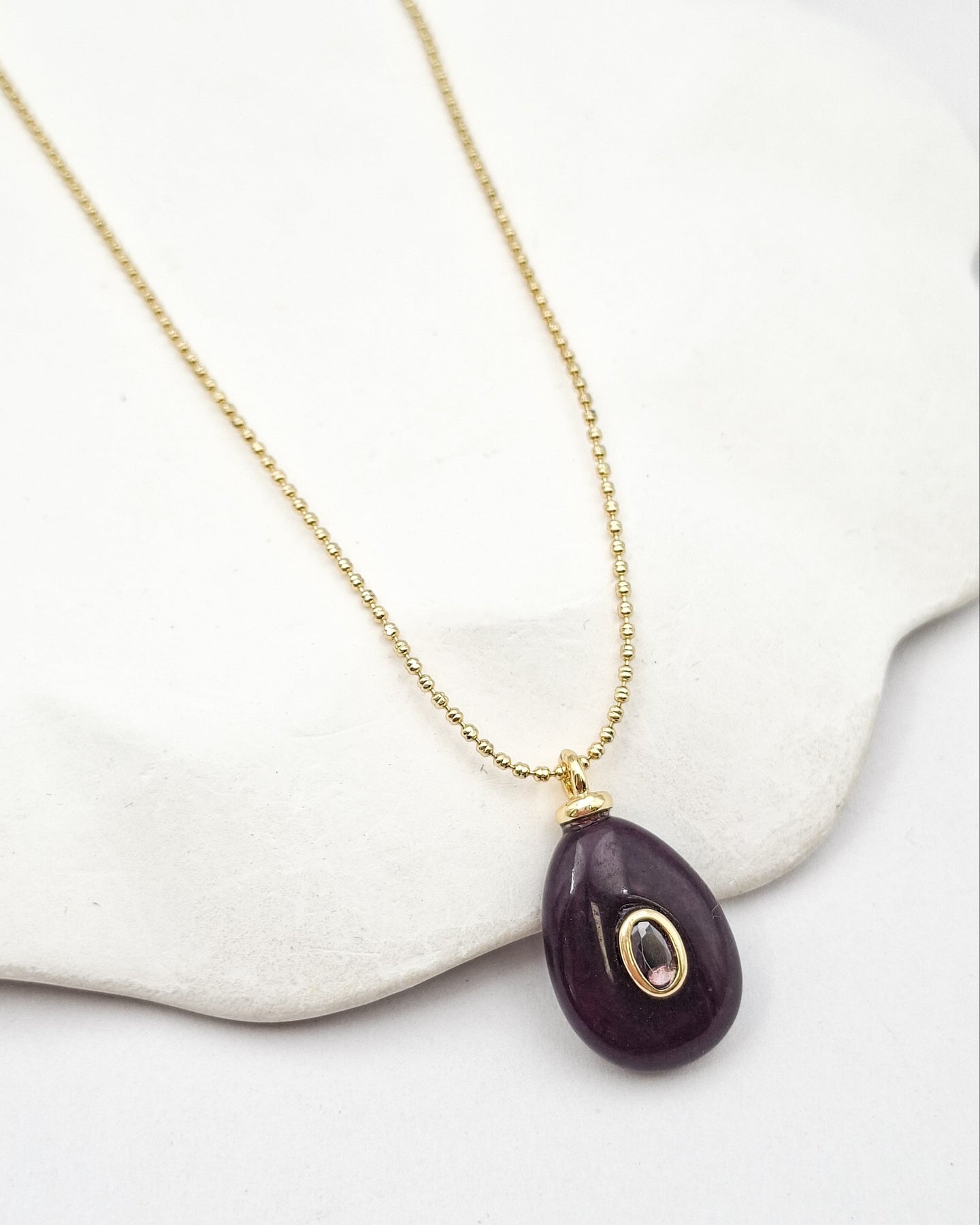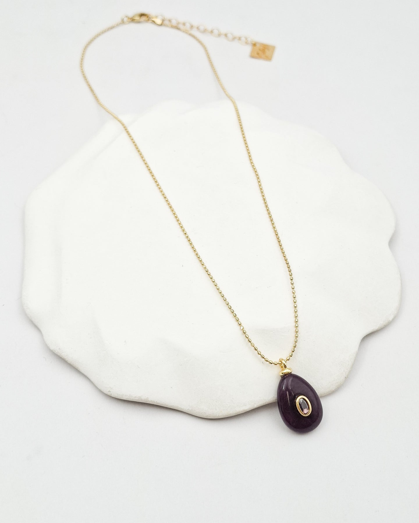 שרשרת כדוריות קצרה עם תליון מקסים של אבן טבעית סגולה בצורת טיפה משובצת זירקון אובלי בגוון סגול. ניתן לענוד לבד או בשילוב שרשראות נוספות למראה שכבות. השרשרת בציפוי ישראלי איכותי והיפואלרגני של זהב 24 קראט. הפריט מגיע ארוז למתנה ועם אחריות לשנה. ניתן להוסיף ברכה אישית ופתק החלפה.